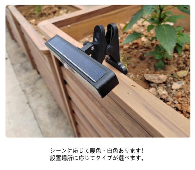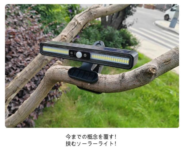 | 挟めればどこでも設置OK 配線不要/電気代0円 点灯3モード搭載 ソーラーライト 白色・暖色 今までの概念を覆す! 挟むソーラーライト! こんな悩みありませんか? ・壁に穴を開けるのは抵抗がある… ・ライトがないところは不便… ・ライトを設置できる場所がない… 木の枝や棒など挟めるところならどこでも設置可能。 場所を選ばず感覚的に設置できる シーンに応じて暖色・白色あります! 設置場所に応じてタイプが選べます。 配線要らず!電気代も0円省エネ! 日中は太陽光で6〜8時間充電し、夜間になると自動で点灯します! ※天候状態により充電が不足すると点灯しないことや点滅することがあります。 3つの便利な点灯モードを搭載! 3つのモードがあり、用途に応じて設定が可能です。 人感センサー、常灯モードとシーンに合わせてお使い頂けます。 雨に強く耐久性が高い、IP68仕様。 120度角度調整が可能で 設置場所や照らしたい場所でお好みの 角度で設置できます。 大型LEDチップを36個使用 驚異トップクラスの明るさ 自宅だけでなくアウトドアなどで 持ち運びもできる手軽さなので 使いたいときにサッと持ち運んだり取り付けができます。 人感センサーは2パターンあり モード1は人が通ると点灯し、人を感知しなくなると低輝度で点灯します。 モード2は人が通ると点灯し、一定時間で自動で消灯します。 モード3は常灯モードで夜間ソーラーパネルに光が当たっていない場合常に光り続けます。 明暗センサーが搭載され、夜間になれば自動的に電源がオンになり、 朝になると自動的にオフになります。 防水防塵仕様のため、雨風の強い荒天時でも使用可能です。 玄関先や庭・駐車場など屋根のない場所でも使えてとても便利です。 屋外のエクステリアはもちろん、ガーデンライト、玄関灯、夜間での作業など クリップ式なので取り付け持ち運びに優れており、利便性が高いです。 | |
