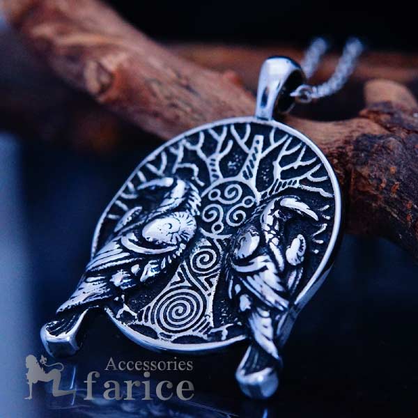 ・民族的な幾何学模様の大樹に立体的な2匹のオウムがたたずむ神秘的なペンダントネックレス