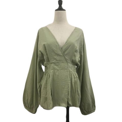 【中古】ローリーズファーム ブラウス プルオーバー Vネック カシュクール風 ゴムシャーリング 長袖 F 緑 黄緑