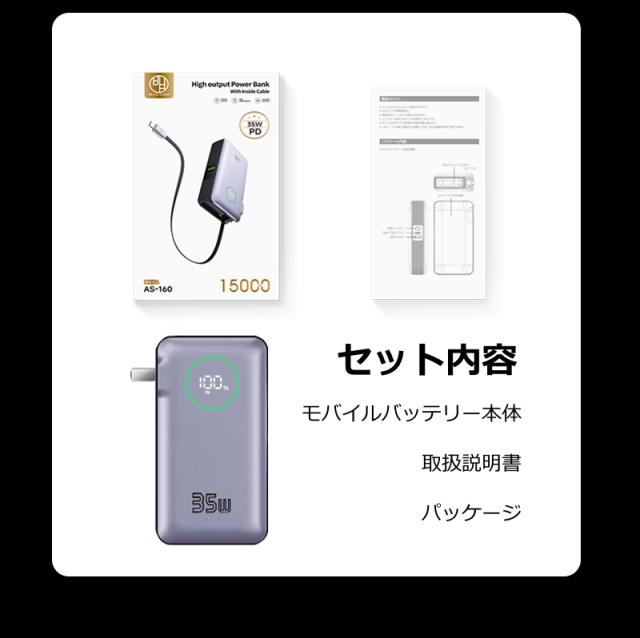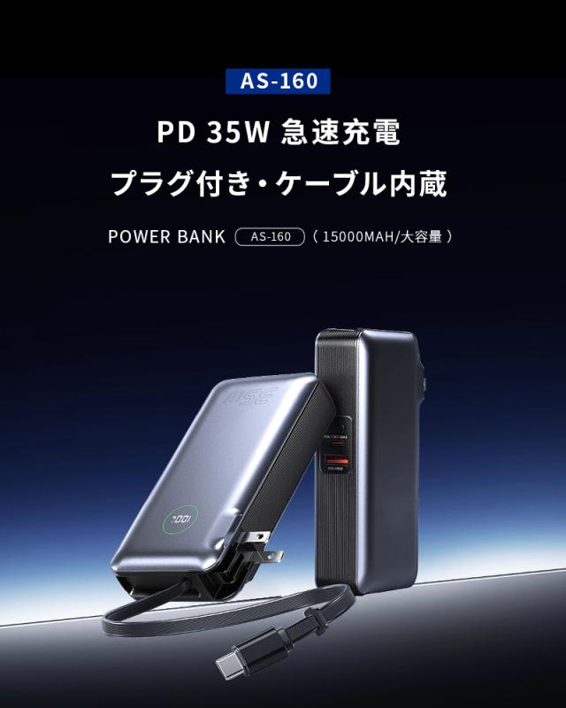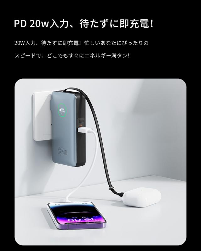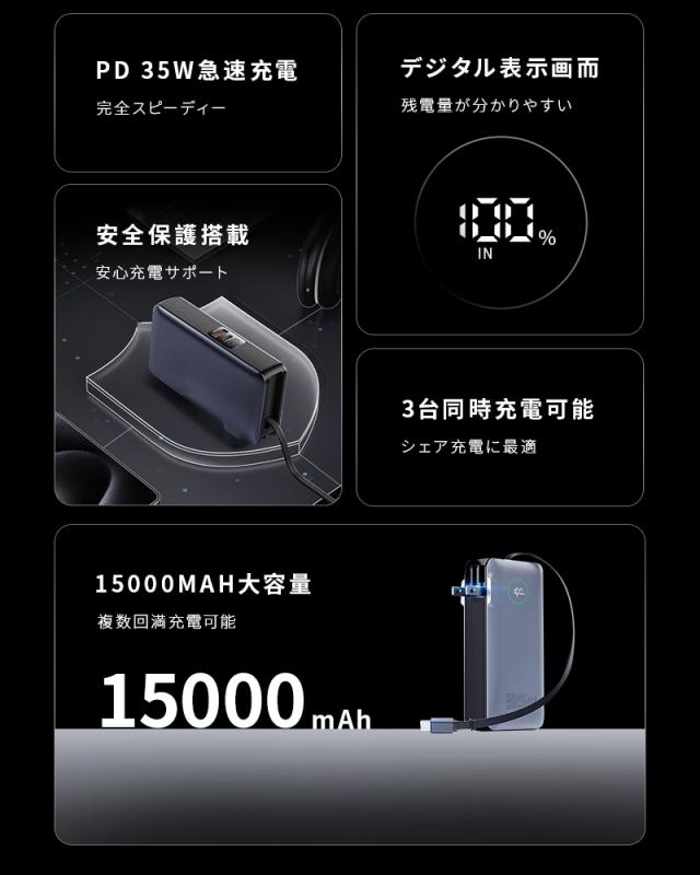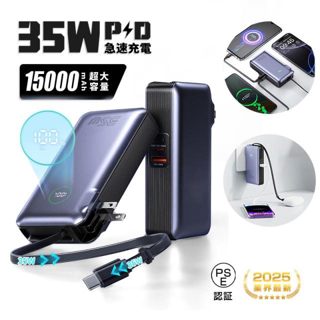 モバイルバッテリー 15000mAh 57.75Wh 大容量 【2025年新モデル】コンセント一体型 ノートPC充電対応 ケーブル内蔵 3台同時充電 3in1 USB-C出入力ポート iPhone17/16/15充電 PD35W 急速充電 iOS/iPad/Android各機種対応 防災グッズ PSE認証【PL保険加入済み製品・安心】