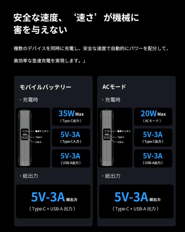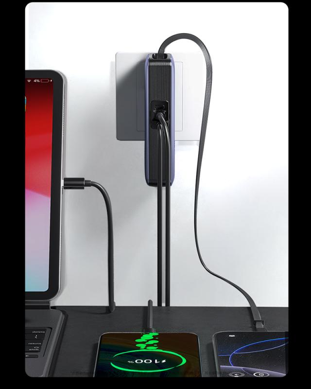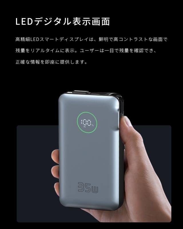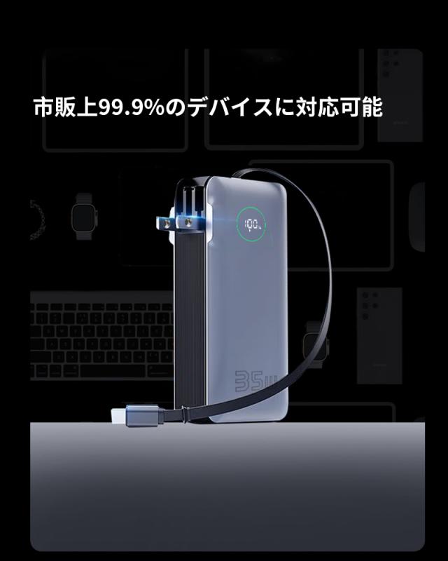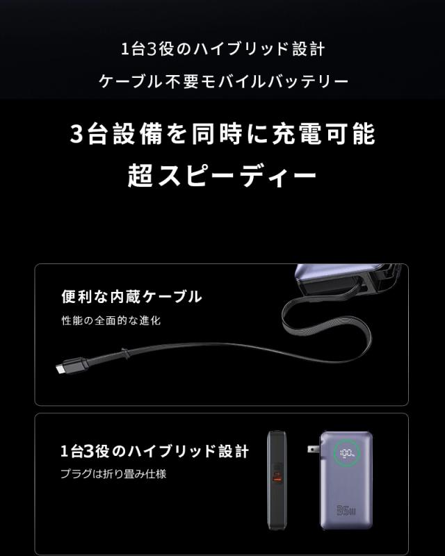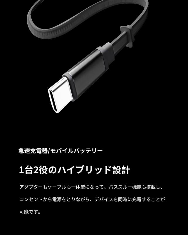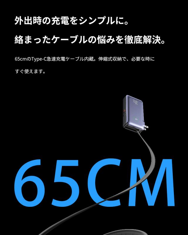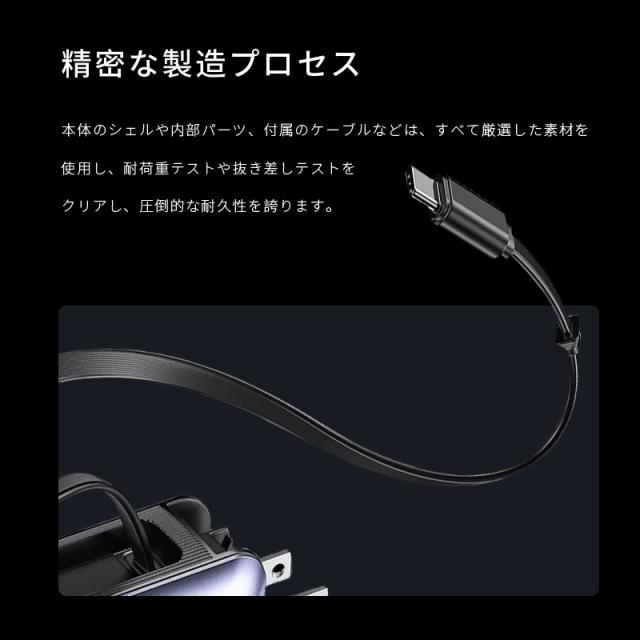 巻き取り式のUSB Type-Cケーブル(全長65cm)が内蔵!持ち運べる荷物を減らせるだけでなく、ケーブルを忘れて充電できないといった心配がありません。USB-AとType-Cの出力ポートもあるため、端末3台の同時充電に対応。
