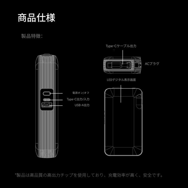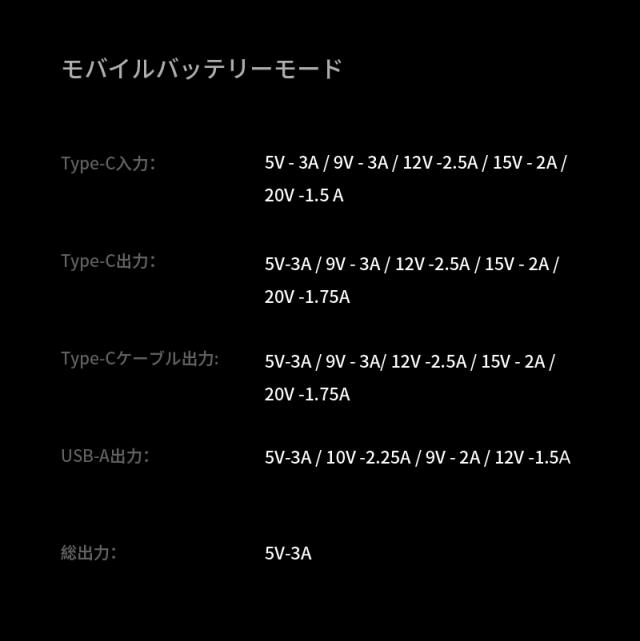 Type-C出力:5V/3A 9V/3A 12V/2.5A 15V/2A 20V/1.75A