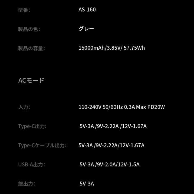 USB-A出力:5V/3A 9V/2A 12V/1.5A