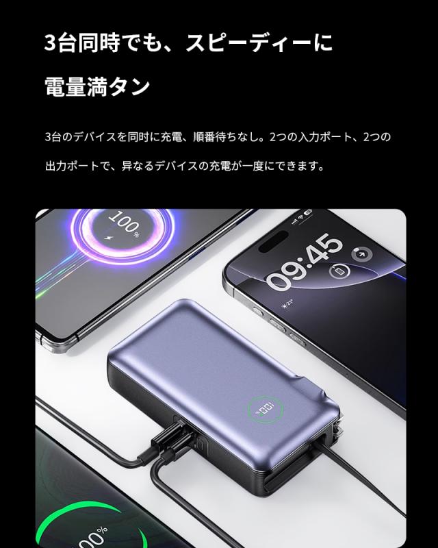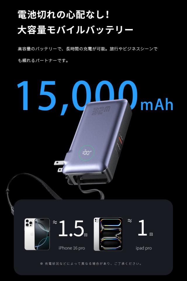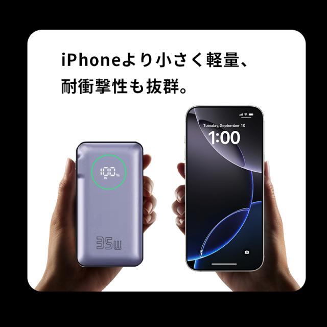 iPhone 16を約2.5回ほど充電できる大容量モバイルバッテリーです。旅行先では家族とシェアしたり、出張中に社用携帯と個人端末を同時に充電できるなど満足感のある容量です。