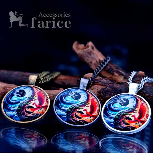 陰陽マーク 青 赤 ドラゴン フェニックス 龍 鳳凰 水 大地 凸ガラス ペンダント ネックレス 【銀/銅/黒】