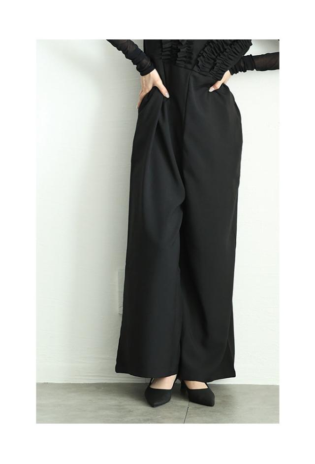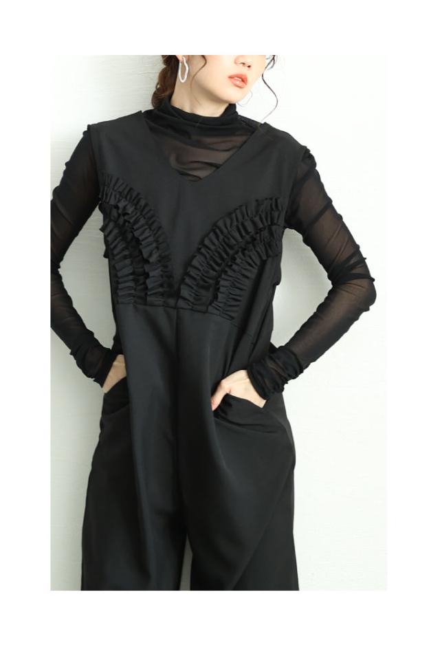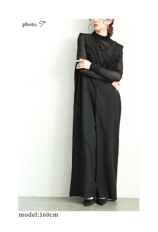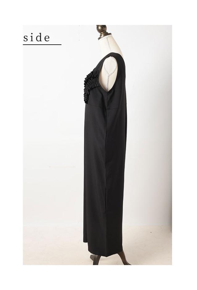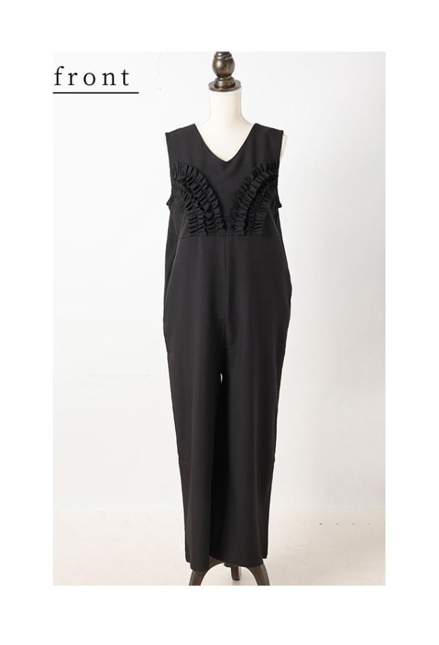 春新作 可愛らしさを添える胸元フリルのワイドレッグオーバーオール レディース ファッション ワンピース オーバーオール 黒 春 大人可愛い 40代 レディースファッション 50代女性 ファッション 60代 ミセスファッション サワアラモード sawaalamode otona almam-191806