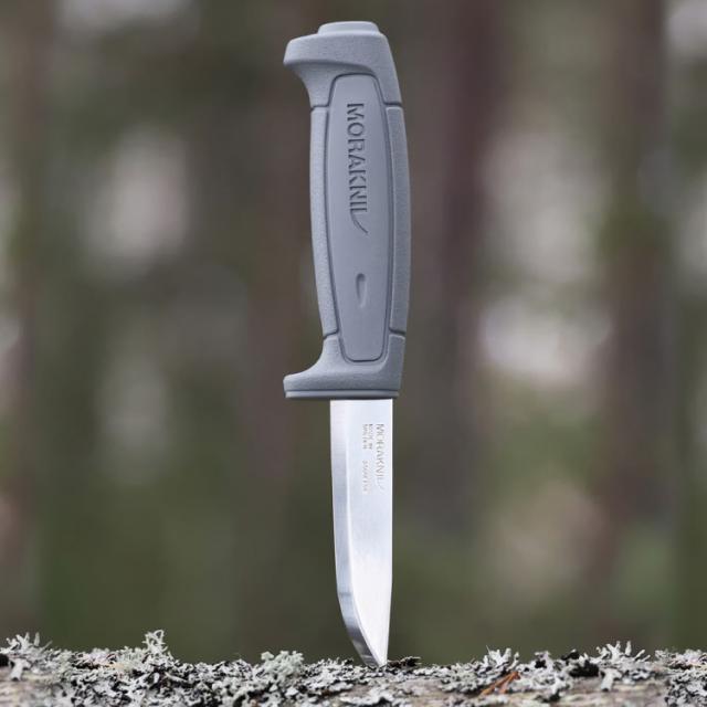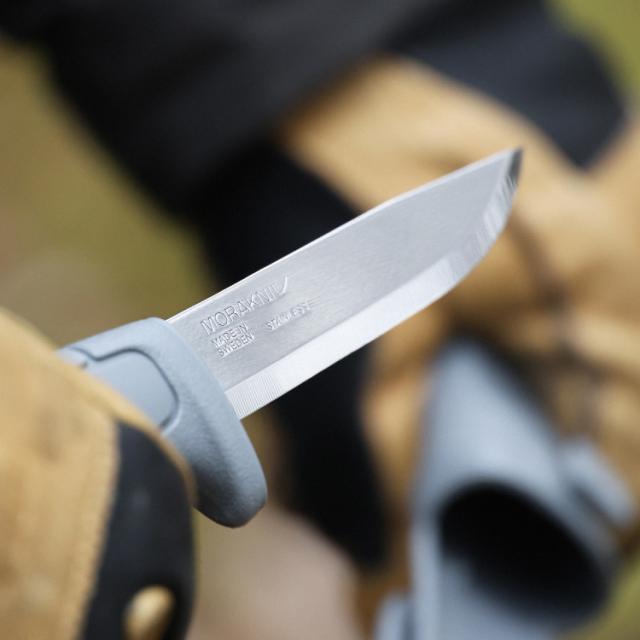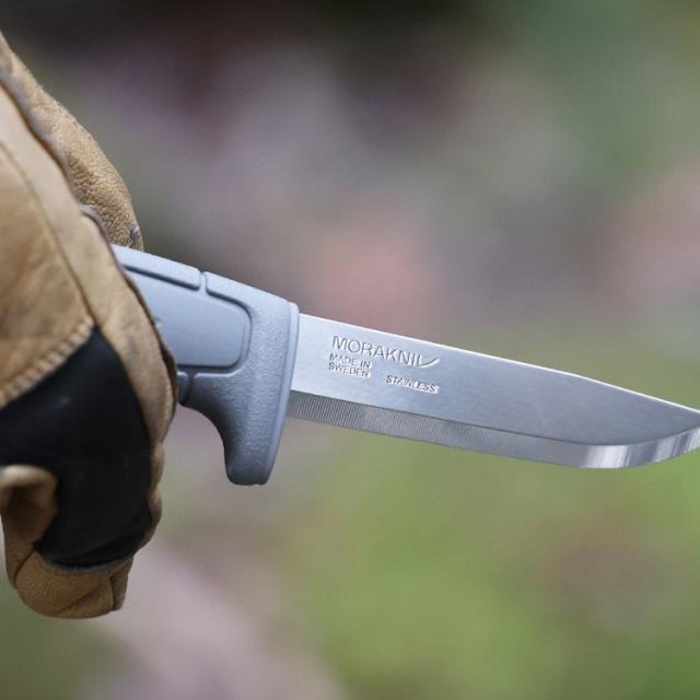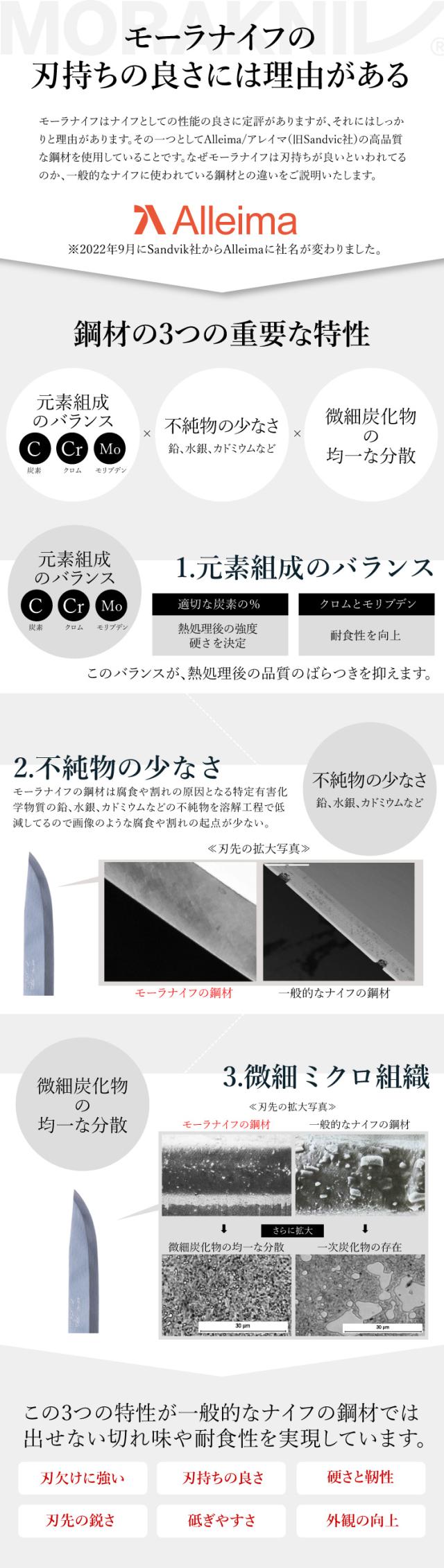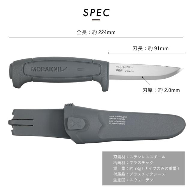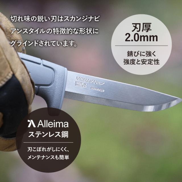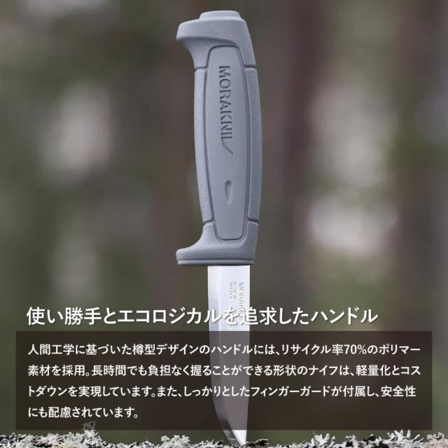 ブレードにはスウェーデン Alleima(旧Sandvik)製のリサイクルステンレス鋼を採用。近年では、ステンレス製品のほとんどがリサイクル合金を使用し、モーラナイフの鋼も80%以上がリサイクルされたスウェーデン鋼からなる合金で作られています。そのステンレス鋼材を、モーラナイフの自社工場で加工・製造し、十分な耐久性を持った鋼材を生み出しています。また、切れ味の鋭い刃はスカンジナビアンスタイルの特徴的な形状にグラインドされています。 また、ブレードのスパイン(背の部分)の仕上げ処理を省くことで加工コストを削減。気兼ねなく使いたい一本になっています。