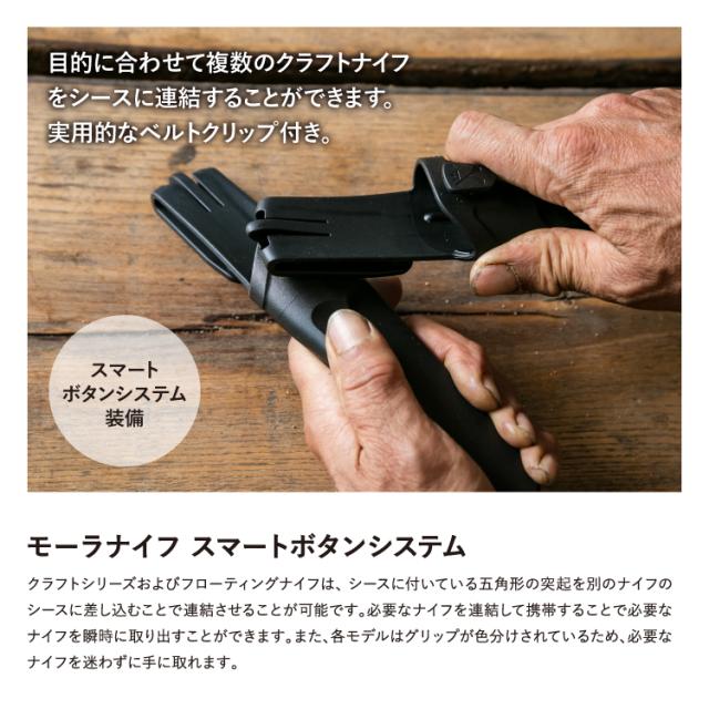 リサイクルポリマー製のシースには、様々なリサイクル素材が使用されていることを示す、このナイフだけの文言がプリントされています。また、「モーラナイフ スマート ボタン システム」が装備されており、目的に合わせて複数のクラフトナイフをシースに連結することができます。ベルトに簡単に取り付けられる実用的なベルトクリップも付いています。 ※スマート ボタン システムは、クラフトシリーズのナイフとフローティングナイフに対応しています。