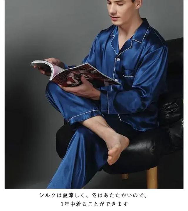| 高級の素材を使用したサラサラ、トロトロ、ツルツルの上質なシルク混のパジャマ上下セットです。 一度身に着けたら、やみつきになってしまうほど。 シルクは夏涼しく、冬はあたたかいので、1年中着ることができます。 夏の暑い時に汗をかいても肌表面はシルクの吸湿性によりサラッとしています。 また、寒い時期には体温の熱をしっかり吸収、温かい空気層が体を包み、保温性を発揮してくれます。 シルクの繊維には、ほどよく水分が含まれているため、電気抵抗が小さく静電気がおきにくいのが特徴です。 そのため、アレルギーの原因となるホコリを寄せ付けにくく、抗菌性にも優れているといわれています。 シルクには天然のUVカット効果があります。 | |
