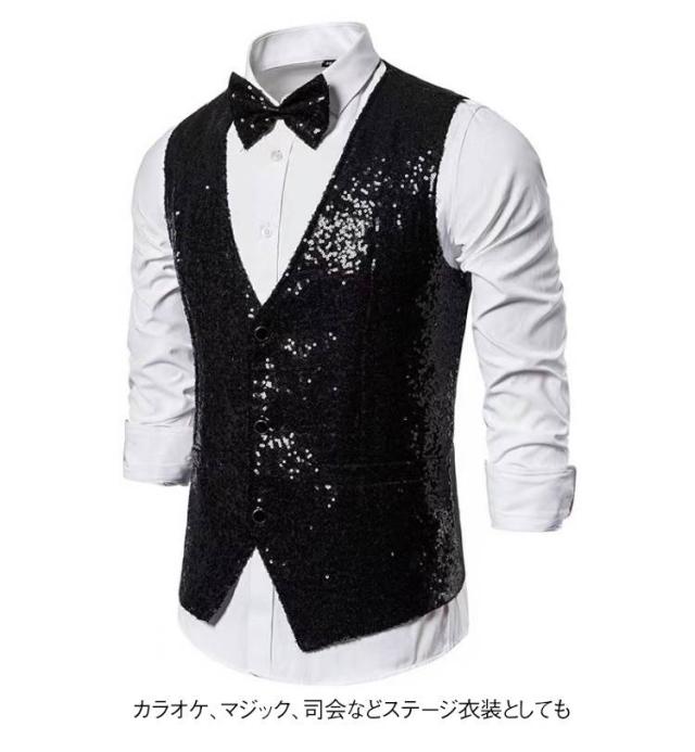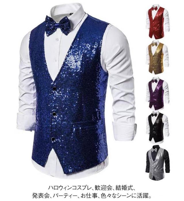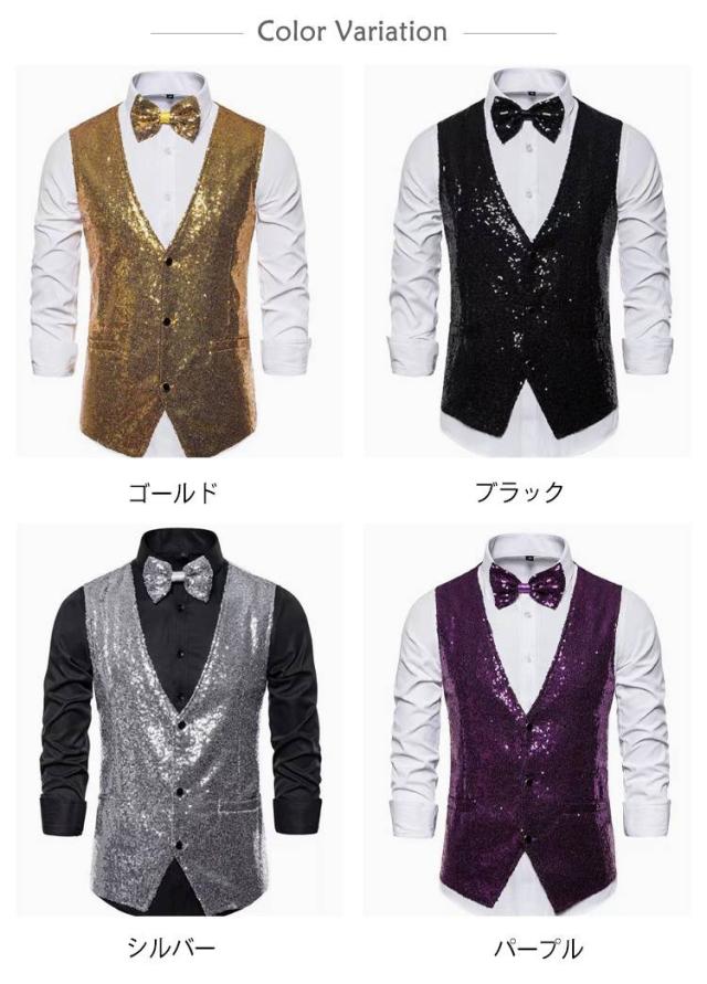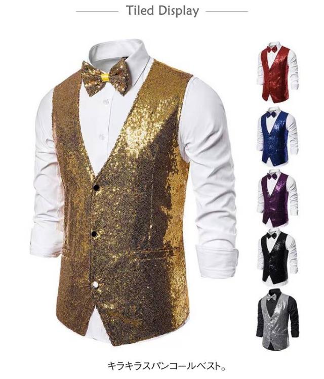 | キラキラスパンコールベスト。 フロント部分は遊び心あふれる総スパンコール!注目度アップは間違いなし! ハロウィンコスプレ、歓迎会、結婚式、発表会、パーティー、お仕事、色々なシーンに活躍。 カラオケ、マジック、司会などステージ衣装としても◎ | |