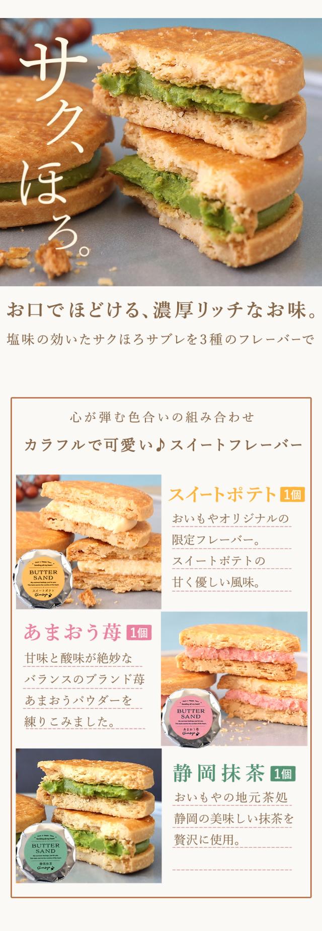 3種からお選びいただけます。 バターサンドはなめらかバタークリームとさくほろ塩サブレが