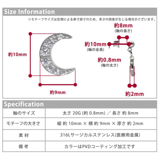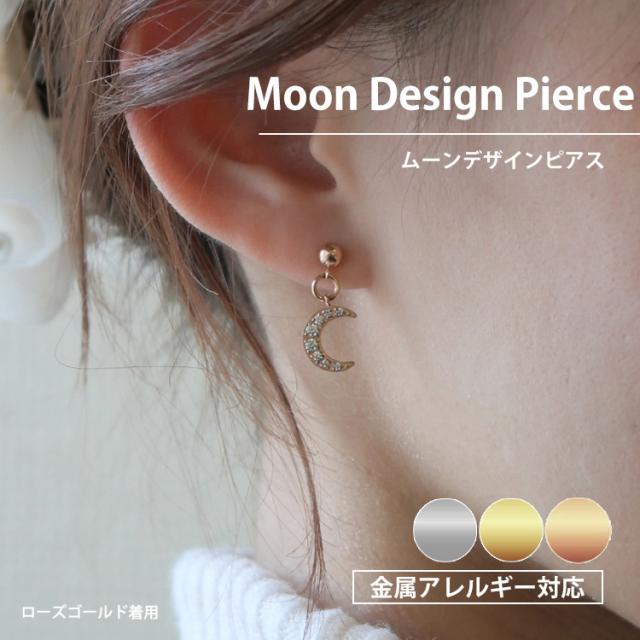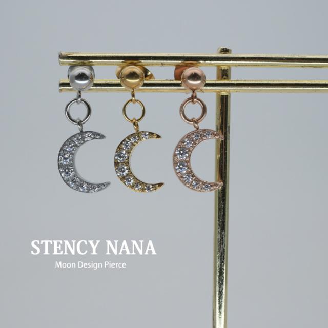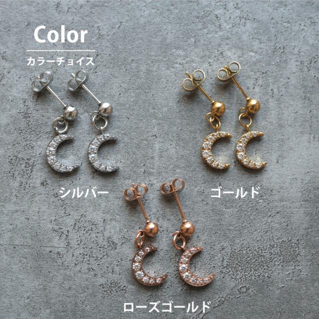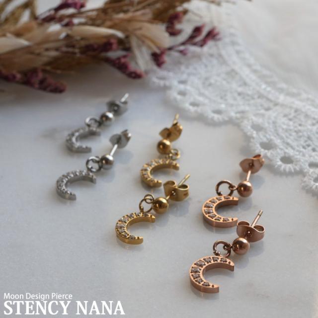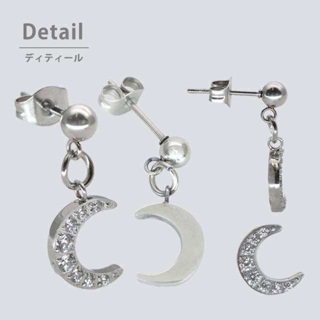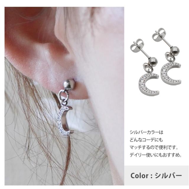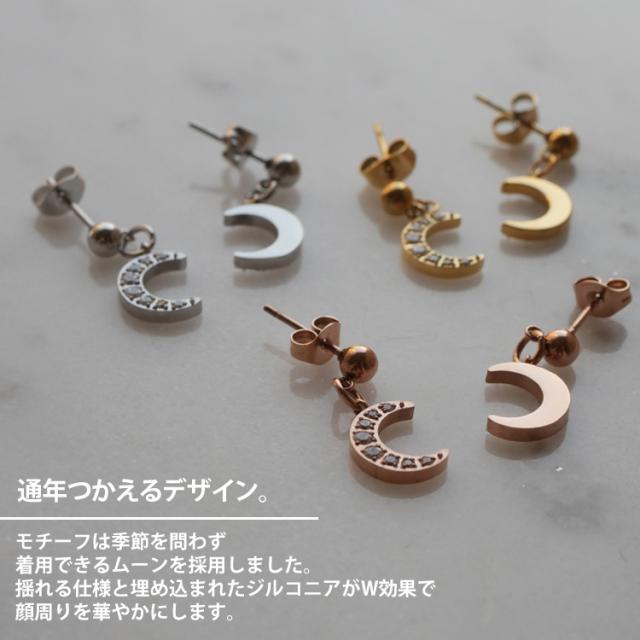 モチーフは季節を問わず着用できるムーンを採用しました。揺れる仕様と埋め込まれたジルコニアがW効果で顔周りを華やかにします。 素材には、金属アレルギーの方にも安心なサージカルステンレスを使用。使い勝手の良さとデザインが魅力的なステンレスピアスを是非お試しください。シルバーやホワイトゴールド、プラチナで金属アレルギーが出てしまう方にもオススメです。