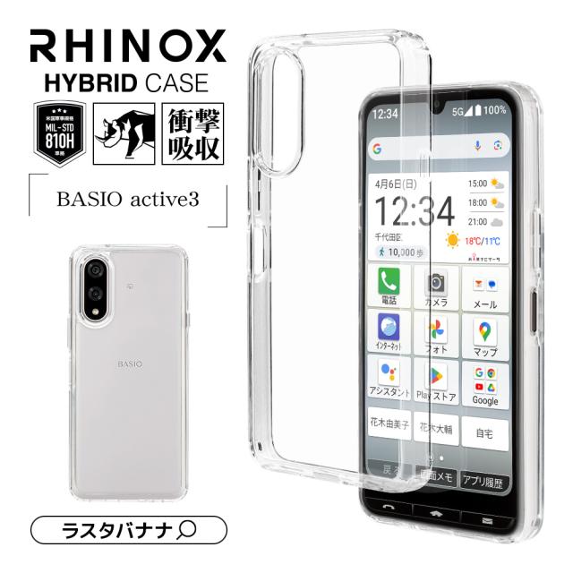 BASIO active3 ケース カバー ハイブリッド RHINOX ライノックス 耐衝撃吸収 高透明 クリア MIL規格 表面硬度5H ベイシオアクティブ KYG04 スマホケース 8785BAA3HACL ラスタバナナ