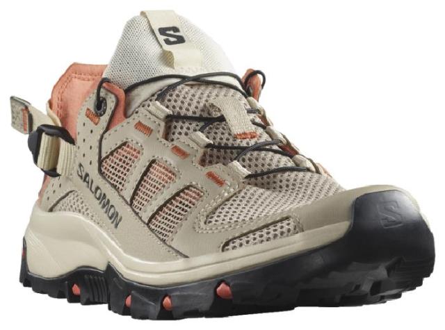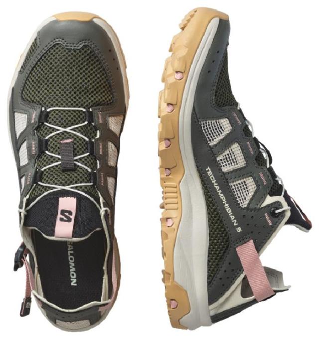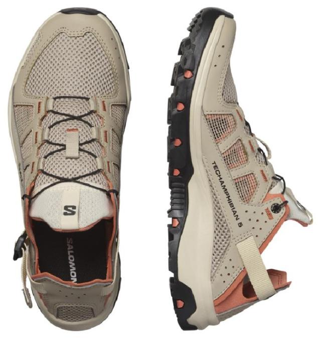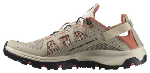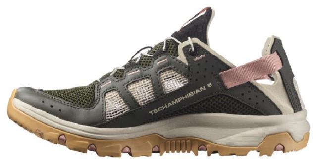 TECHAMPHIBIAN 5 は補強トゥキャップと完全縫合構造により足を確実に保護。アウトソールが地面に密着し、濡れた滑りやすい地面でも信頼できるグリップを発揮します。かかとを折りたたんで履ける多目的に使いやすいデザイン。アッパーには速乾性と通気性に優れた素材を採用しました。