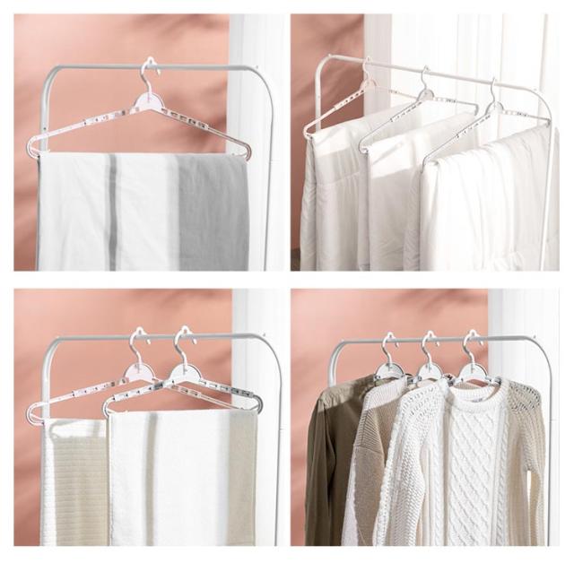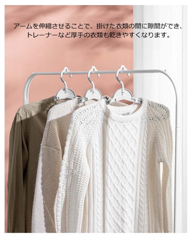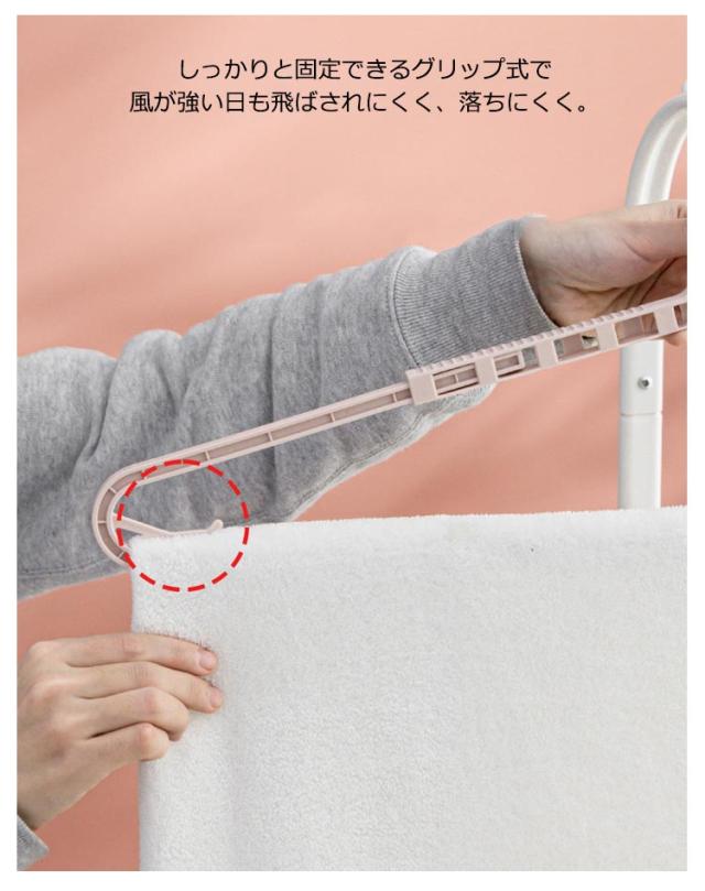 | お得な4本セット!伸縮機能のあるバスタオル用ハンガーです。 42-66cmまで伸縮可能、大判のタオルやシーツ、 毛布なども掛けることができます。 プラスチック樹脂製で耐久力に優れた、型崩れせず、重さにも耐えられます。 フック部分がぐるぐる360度回転するので、洗濯物を掛けると取り出すことは便利です。 しっかりと固定できるグリップ式で風が強い日も飛ばされにくく、落ちにくく。 アームを伸縮させることで、掛けた衣類の間に隙間ができ、トレーナーなど厚手の衣類も乾きやすくなります。 | |