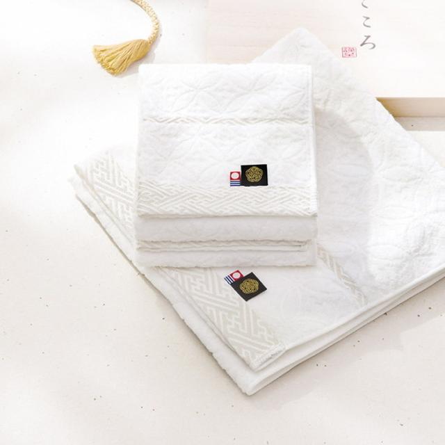 平安時代の女流歌人、小野小町が美しかったことから美しい女性の呼び名として使われる小町。今治で評判の美しい娘をイメージし、伝統の織技術を駆使して一つ一つ織り上げていく。そんなシリーズが今治小町です。 お慶びの七宝柄を毛中のジャガードで表現、光沢の糸で紗綾形模様を地づり紋織でヘムを際立たせた高級感あふれる演出のタオルギフト。