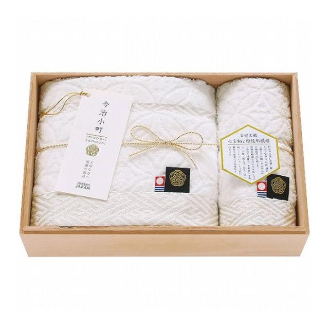 平安時代の女流歌人、小野小町が美しかったことから美しい女性の呼び名として使われる小町。今治で評判の美しい娘をイメージし、伝統の織技術を駆使して一つ一つ織り上げていく。そんなシリーズが今治小町です。 お慶びの七宝柄を毛中のジャガードで表現、光沢の糸で紗綾形模様を地づり紋織でヘムを際立たせた高級感あふれる演出のタオルギフト。