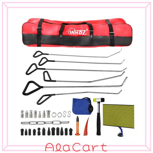 【お得な36点セット】このデントリペアツールセットは型違ったデントリペアツール*6、S型の鈎*2、鉄輪*2、ステンレスチェーン*1、修復ツールヘッド黒いタイプ*12、修復ツールヘッド金属タイプ*7、レッドドアウェッジ*1、オレンジ修復ペン*1、修復槌*1、気嚢 *1、凹み検査工具セット*1、収納バッグ*1があります。