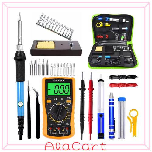 セット内容:はんだごて*1、こて先*5、マルチメータ*1、ごて台(スポンジ付)、はんだワイヤー*1、はんだすいとり器*1、静電防止ピンセット*2、8 in 1精密ドライバー*1、ワイヤーストリッパー*1、電子ワイヤー*2、英語マニュアル*1、商品概要(日本語)*1、PC収納バッグ*1