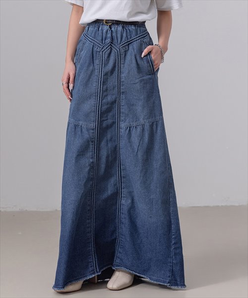 切り替えデザインと裾フリンジがポイントのデニムスカート。