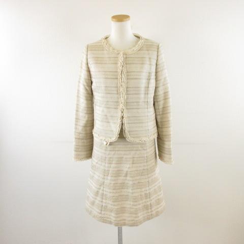 【中古】トゥーシー TWO:C ワンピーススーツ ノーカラージャケット 長袖 ひざ丈 ボーダー ベージュ 38 レディース