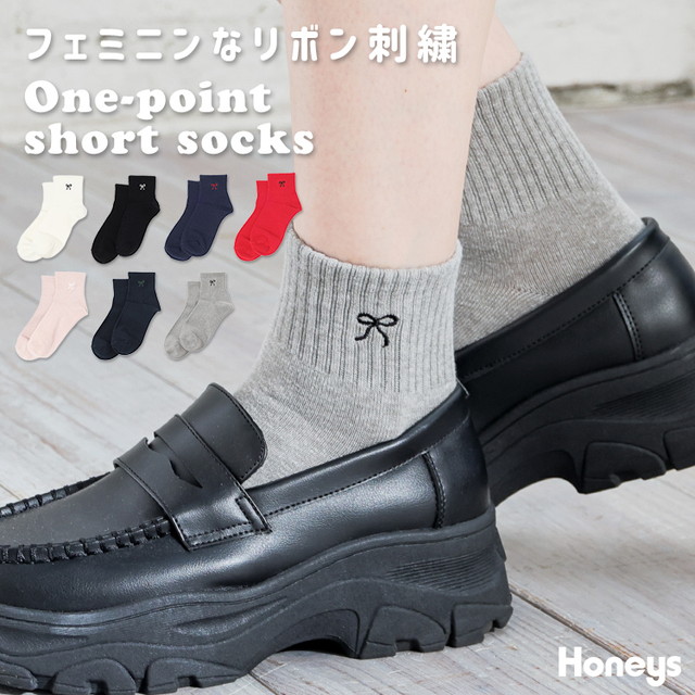 靴下 ソックス ショート丈ソックス ショート丈 リボン刺繍 刺繍 綿混 ベーシックカラー レディース Honeys ハニーズ ワンポイントショート丈ソックス