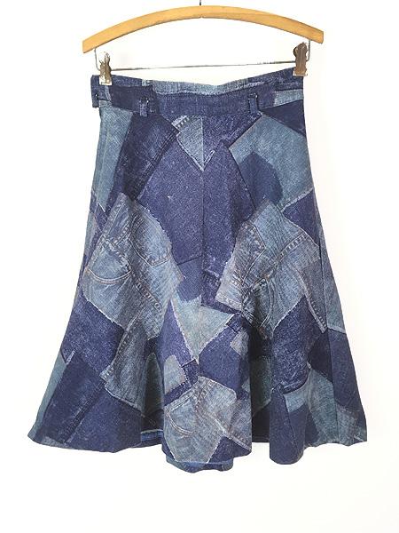レディース 古着 70-80s パッチワーク風 プリント デニム フレア スカート ミディアム丈 S位 古着