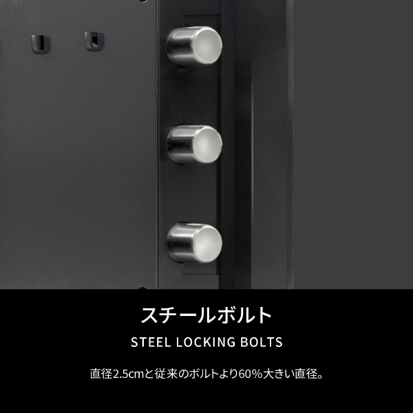 ・3つの直径2.5センチの頑強なセキュリティ構造のボルトは、扉を閉めると自動で施錠。