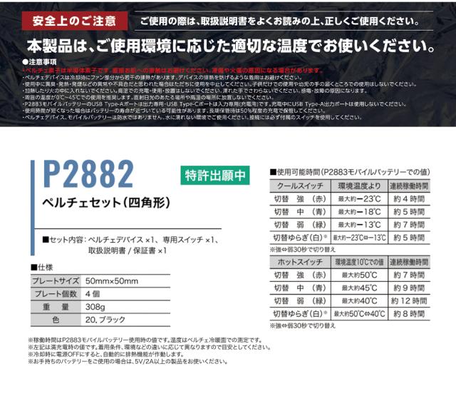 ※稼働時間はP2883モバイルバッテリー使用時の値です。温度はペルチェ冷暖面での測定です。