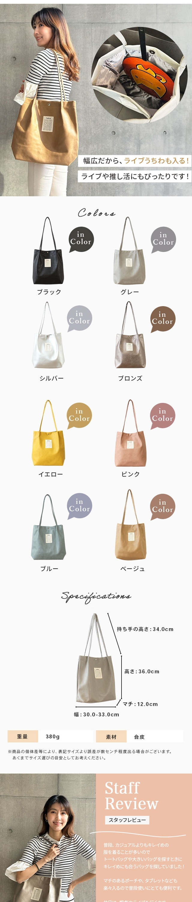 バッグ トートバッグ 肩掛け A4対応 合皮 エコレザー レザー調 ライブ コンサート うちわ 団扇 魂 レディース デイバッグ 収納 実用性 軽量 丈夫 ママバッグ マザーズバッグ 陣痛バッグ ポケット 通勤 通学 絵本袋 レッスンバッグ ビジネス 大人 デイリー プレゼント 小さめ 大容量 旅行 旅行バッグ たっぷり 出張 女性 送料無料 新作 ギフト お返し ホワイトデー 母の日 お婆ちゃん 新生活 カジュアルバッグ レジャー フェス フェスバッグ 旅行用 トラベル 持ち歩き スポーツクラブ 速乾 クリスマス バレンタインデー バレンタイン 福袋 セール お得 ポイント消化 即納 無地 ワンポイント 多収納 大学生 高校生 中学生 OL 会社員 10代 20代 30代 40代 50代 60代 70代 80代 かわいい おしゃれ 黒 仕事 大容量 シンプル メンズ ユニセックス 軽い CIARAポーチ雑貨屋 シアラ OEM 大量注文 ネスリーフ 2025