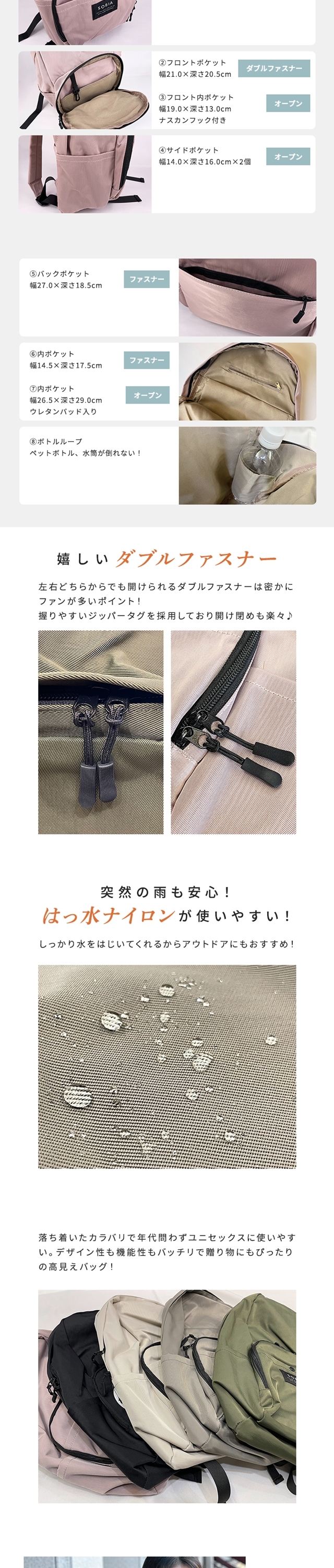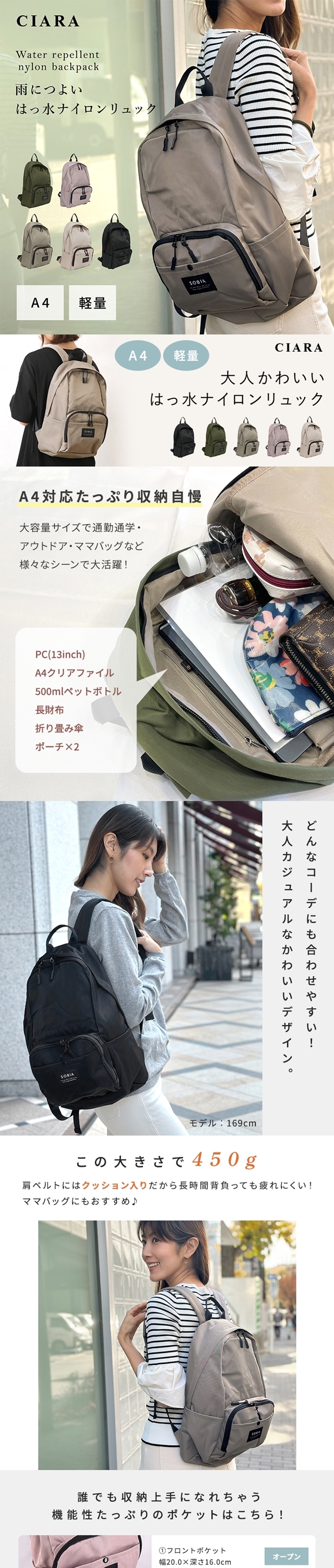 バッグ レディース リュック リュックサック A4 はっ水 撥水 ダブルファスナー ママバッグ マザーズバッグ 旅行 パッキング 旅行用バッグ 無地 シンプル 大容量 ファスナー付き 多収納 軽い 軽量 収納 丈夫 小さめ 大人 大人女子 女性 たっぷり 使いやすい 多機能 高性能 ポケットファスナー 旅行 サブバッグ パッキング 旅行バッグ ビジネス デイリー 仕事 オフィス 通勤 通学 新生活バッグ スポーツ 登山 実用的 仕切り 普段使い 帰省 フェスバッグ 中学生 高校生 女の子 カジュアルバッグ 春 夏 秋 冬 速乾 ポケット多 トラベル 収納ケース 持ち歩き ハイキング レジャー 大学生 ママ OL 会社員 20代 30代 40代 50代 60代 70代 かわいい 可愛い おしゃれ ブランド きれいめ 高見え カジュアル バレンタインデー ホワイトデー お返し 母の日 花以外 敬老の日 孫 クリスマス デート パーティー 彼女 誕生日 新生活 贈り物 福袋 プレゼント プチギフト ギフト セール プチプラ お得 ポイント消化 送料無料 CIARAポーチ雑貨屋 シアラ OEM 大量注文 ネスリーフ 2025 遅れてごめんね