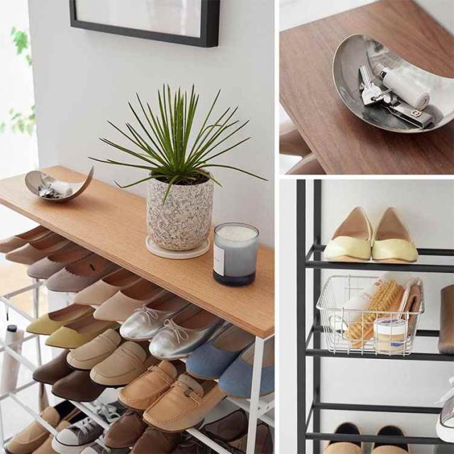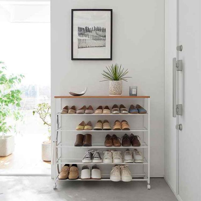 下駄箱に入りきらない靴をまとめて一括収納。横幅90cmのワイドで大容量の天板付きシューズラック5段キャスター付き。エントランスにも馴染むスチールと木の組み合わせがスタイリッシュなデザインです。ストッパー付きのキャスターで、動かしやすく掃除が簡単。天板付きなので鍵や小物、郵便物などを置く棚としても使用できます。付属のフックには靴ベラなどを引っ掛けることもできます。