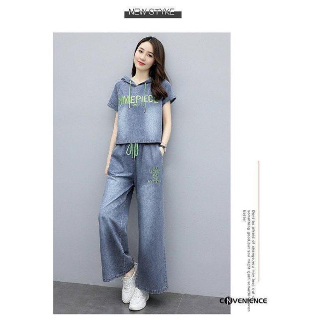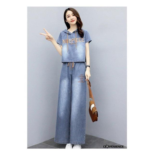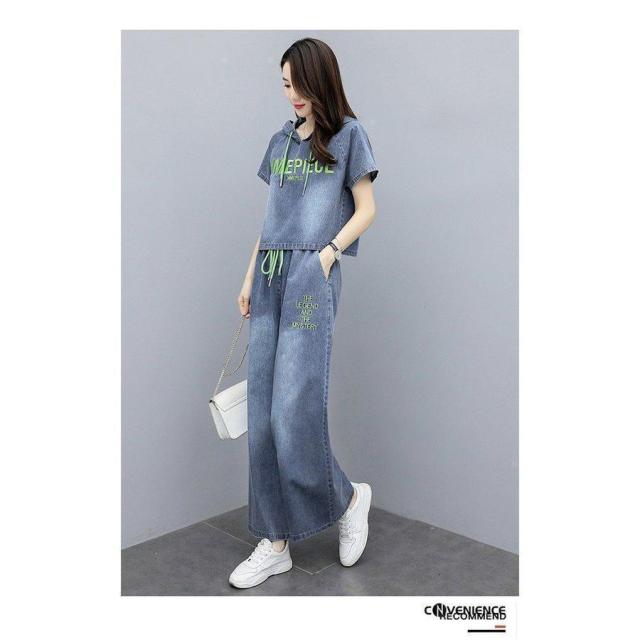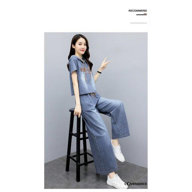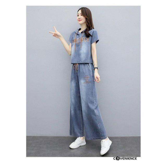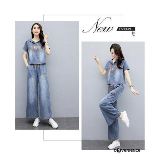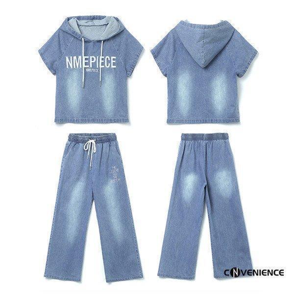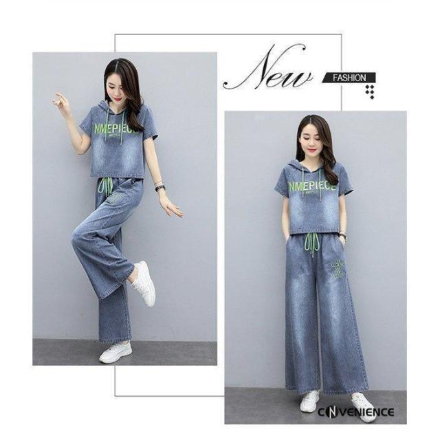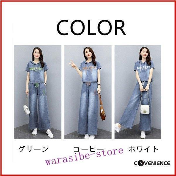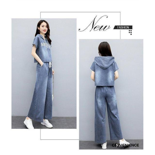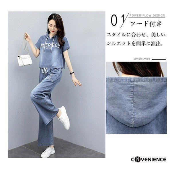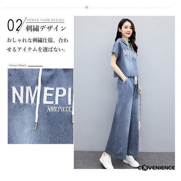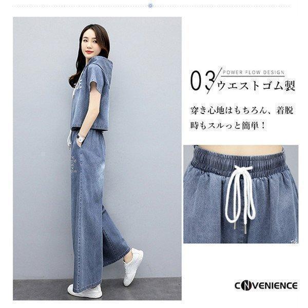 デニム 上下セット セットアップ レディース パーカー フード付き ガウチョパンツ 夏 着痩せ アウトドア カジュアル 部屋着 韓国 母の日 おしゃれ