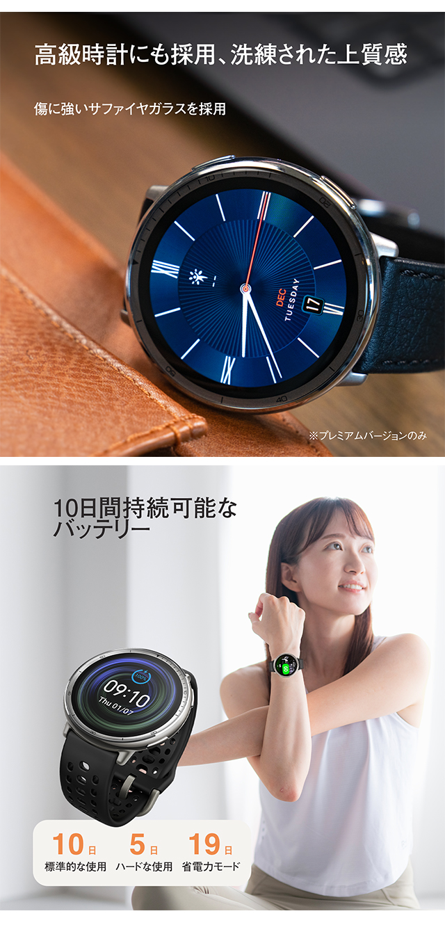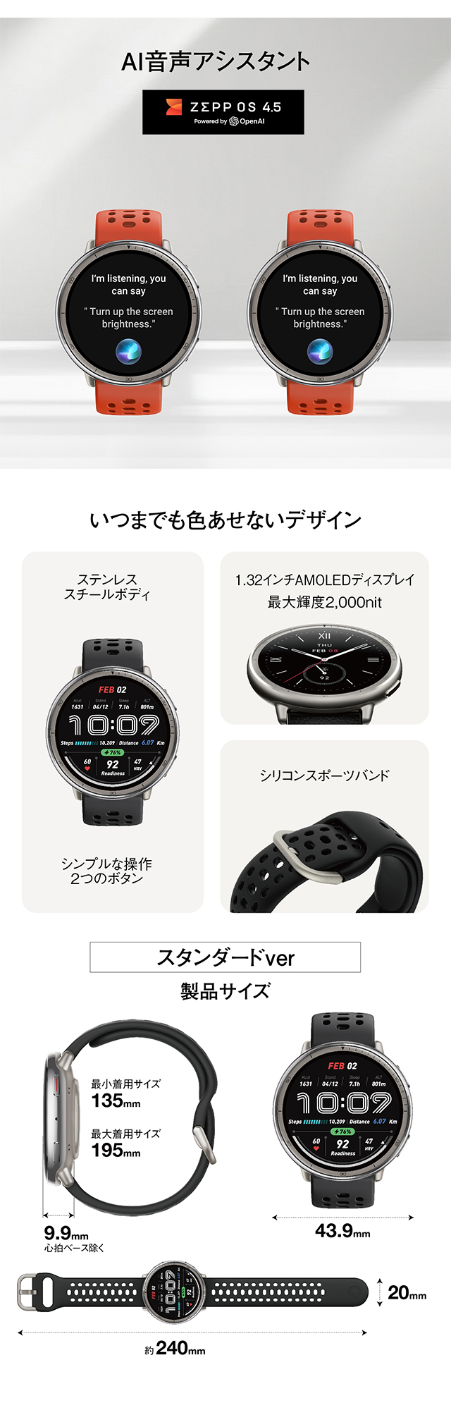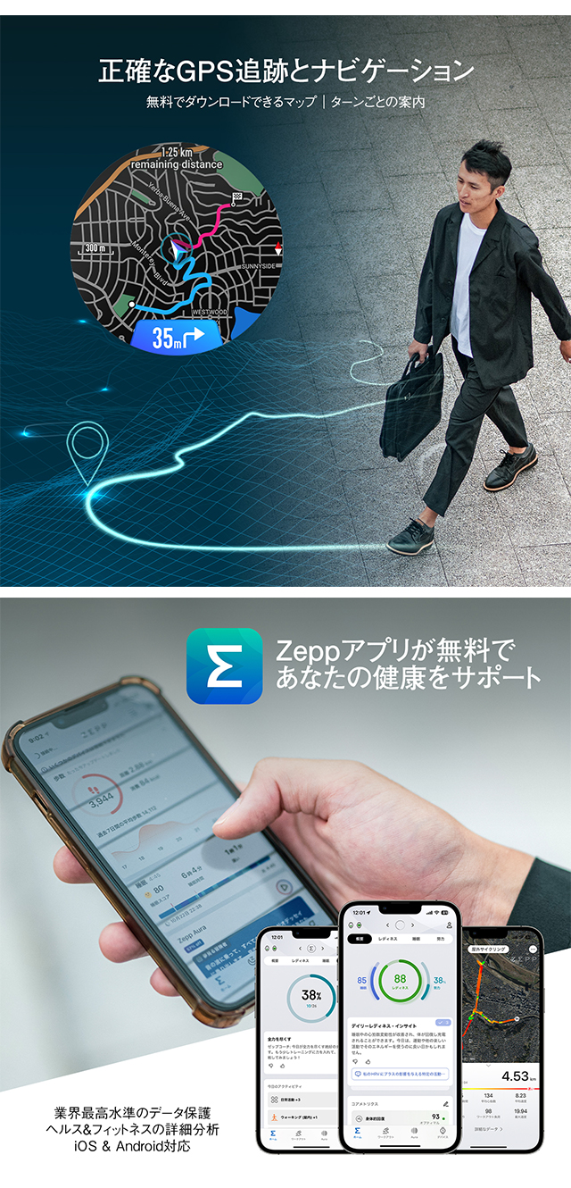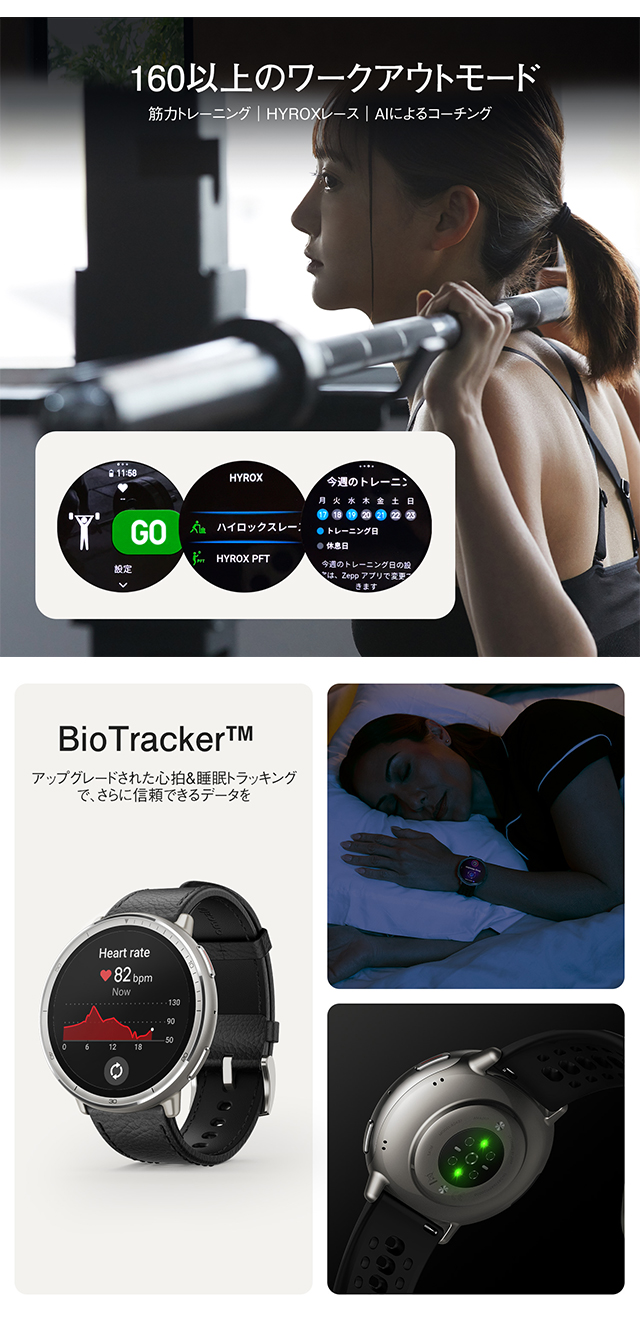 | 仕様 | 日常生活用防水(5気圧) 【ディスプレイ】 素材:HD AMOLED サイズ:1.32インチ 解像度:466×466 PPI:353 【バッテリー】 駆動期間:最大10日間(標準使用) 容量:270 mAh(標準値) 充電方法:マグネット式充電 充電時間:約2時間 【スポーツ機能】 スポーツモード:160+ スマート認識:8つのスポーツ フィットネスアプリとの同期:adidas Running、Strava、Komoot、Relive、Google Fit、Apple Health 【ヘルス機能】 24時間モニタリング:心拍数/血中酸素レベル/ストレスレベル 睡眠の質のモニタリング:睡眠段階(REMを含む) 昼寝の時間/睡眠スケジュール/睡眠時の呼吸の質/睡眠スコア 生理周期トラッキング:有 【センサー】 運動:加速度センサー、ジャイロスコープ、温度センサー、環境光センサー、地磁気センサー、気圧高度計 接続:Bluetooth 5.2 BLE 【その他】 ミニアプリ:対応※一部日本語非対応 アプリ:Zeppアプリ 対応デバイス:Android 7.0 以上、iOS 14.0 以上 |