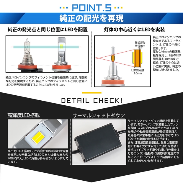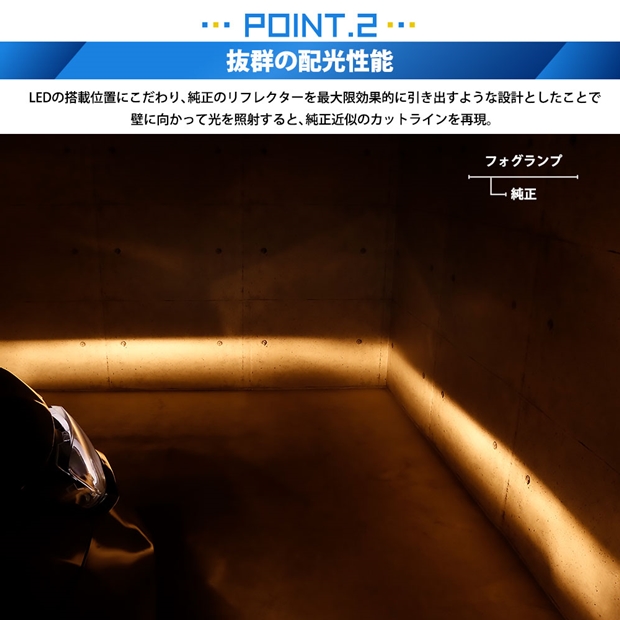 リフレクター性能を最大限効果的に引き出すような設計で純正球の発光位置と同じ位置、灯体の中心にLEDを実装。純正ハロゲンバルブ近似のカットラインを再現しています。