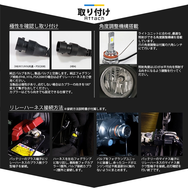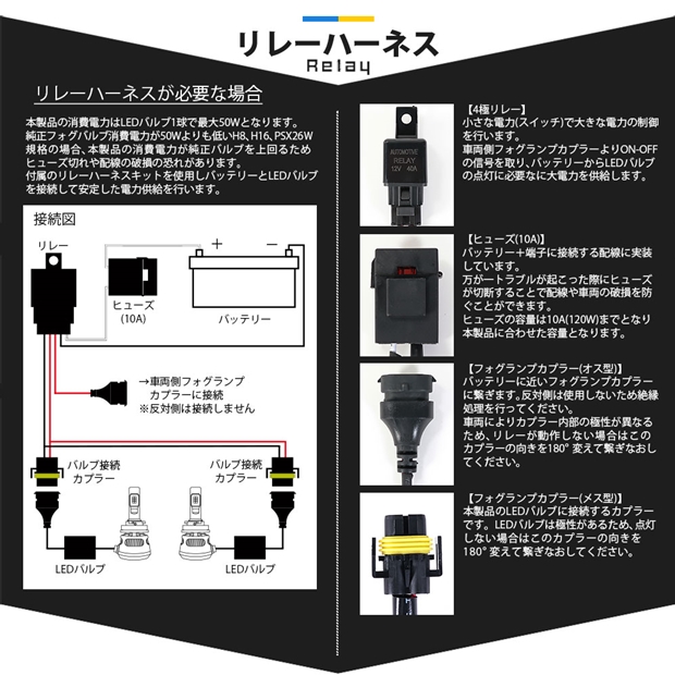 ◆車両のフォグランプ規格がH8、H16、PSX26Wの場合、LEDバルブの消費電力が純正バルブを上回るためヒューズ切れや配線の破損の恐れがあります。付属のリレーハーネスキットを必ずお使いください。