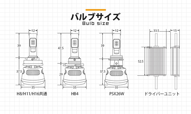 バルブ規格:H8/H11/H16共通、HB4(9006)、PSX26W