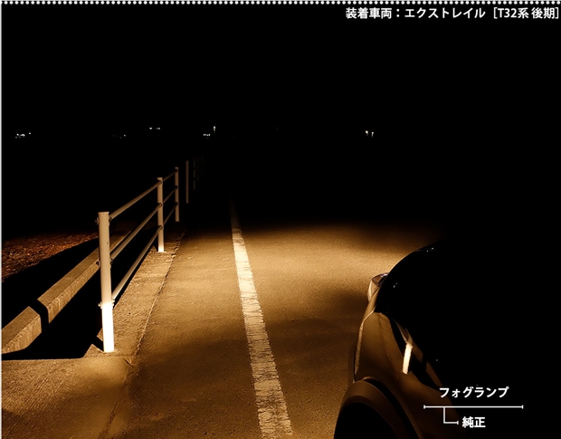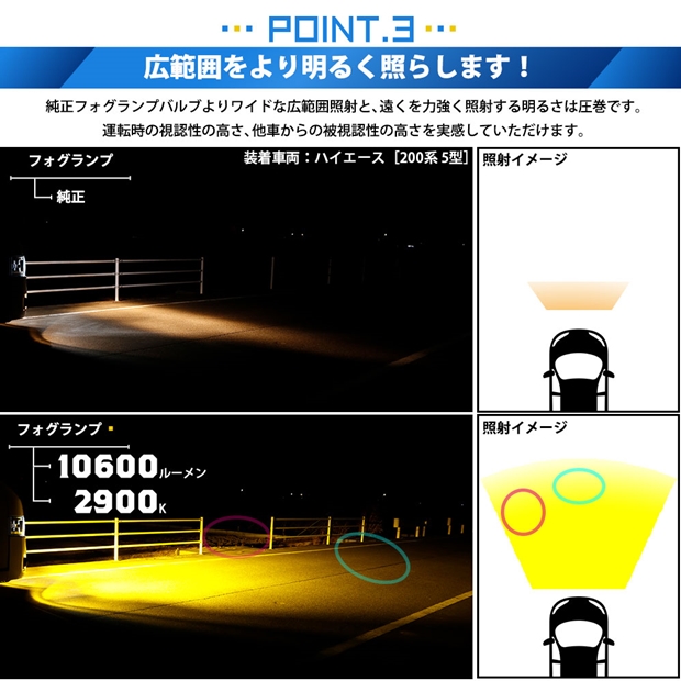 純正フォグランプバルブをよりワイドな広範囲照射と、遠くを力強く照射する明るさは圧巻です。運転時の視認性の高さ、他社からの被視認性の高さを実感していただけます。