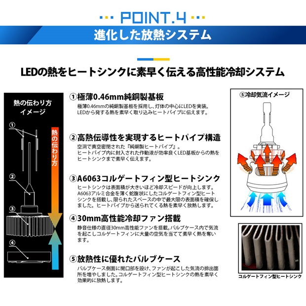 明るさを突き詰めた、超大光量10600ルーメンを実現。 高効率のコルゲートフィン型ヒートシンクと開口部の大きなバルブケースを採用し放熱性能を極限まで高めました。