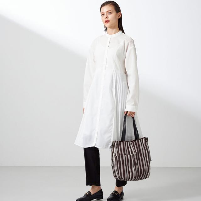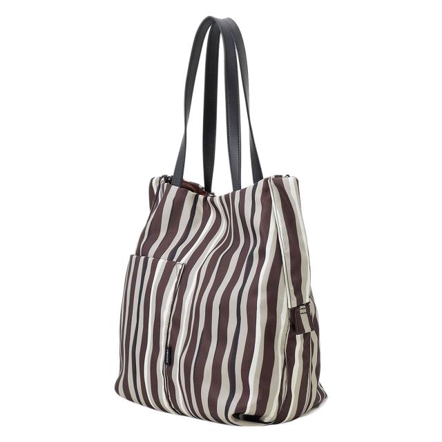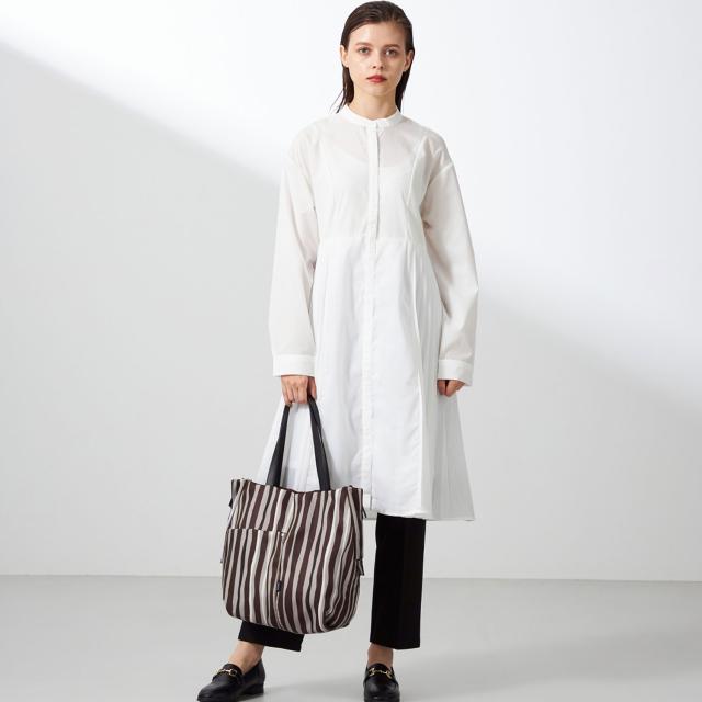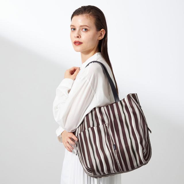 単一なストライプではなく、手書き風のオリジナルプリントを施した、カラフルな配色トート。縦型のトートに縦ストライプで、スマートですっきりとお持ちいただけます。複数の配色で明るめですが、柔らかく合わせやすい色使いに。メイン素材には撥水加工を施しており、突然の雨から荷物を守ってくれます。両サイドのファスナーはロック式で、開けると口開きが良くなり、中の荷物が見やすくなります。