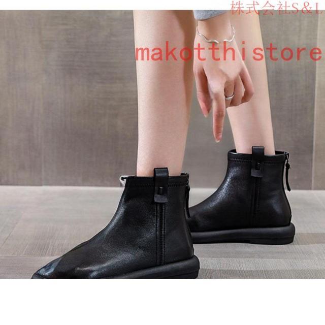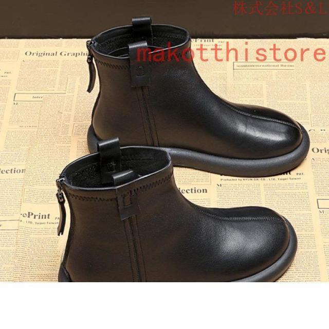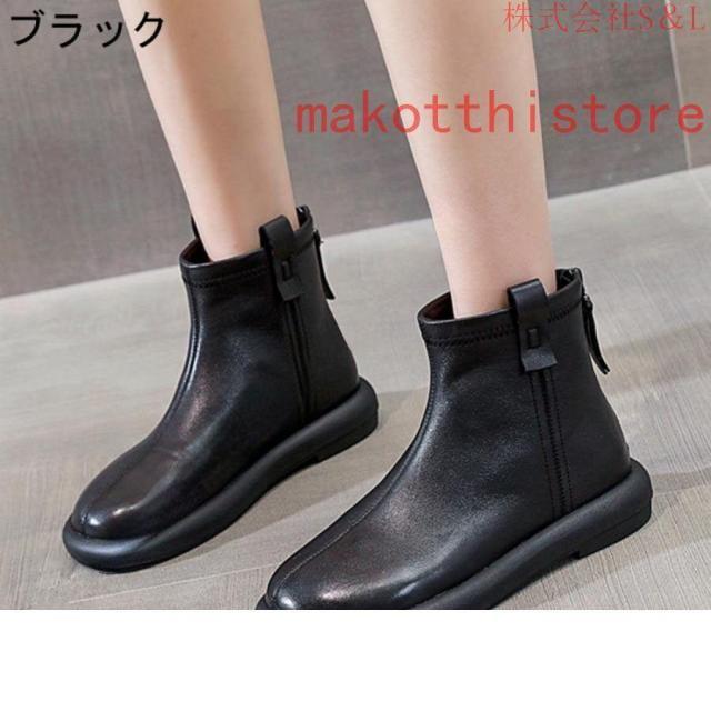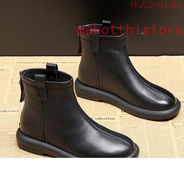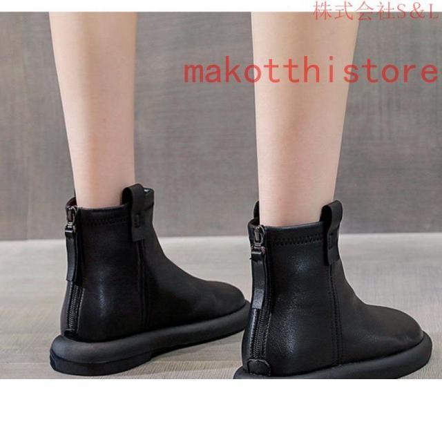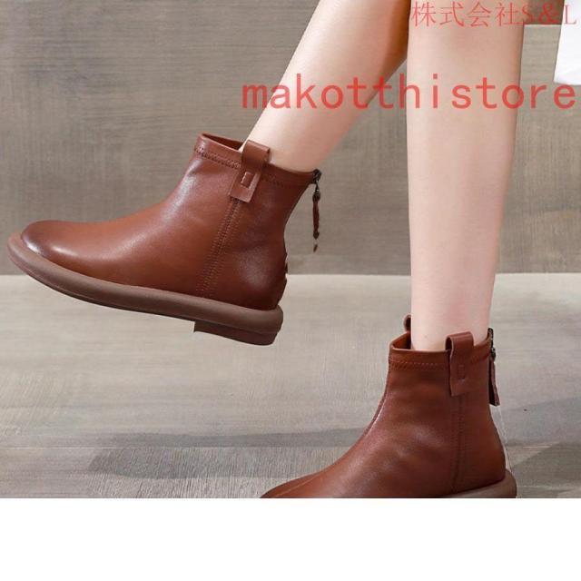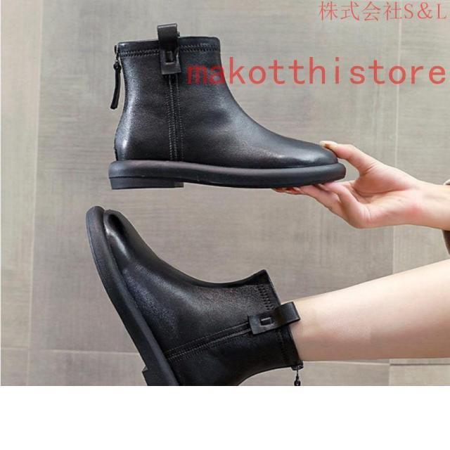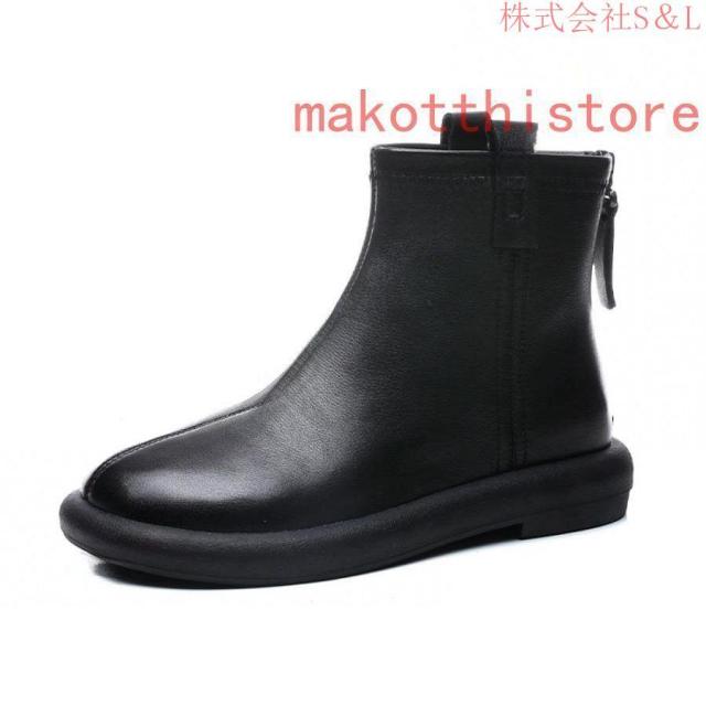 大きいサイズ レディース ショートブーツ 本革 柔らかい フラット ぺたんこ ヒール ファスナー付き おしゃれ カジュアル 黒 レザー 母の日プレゼント