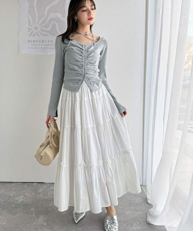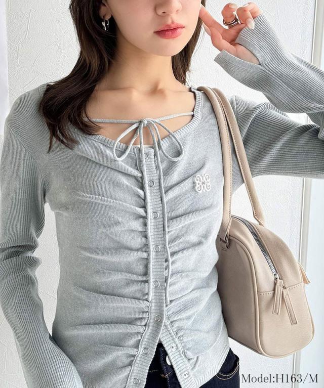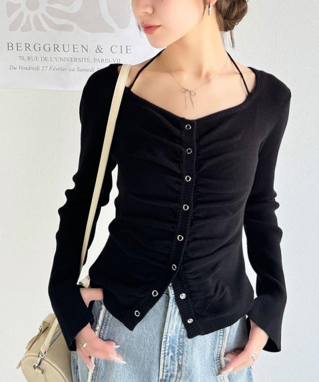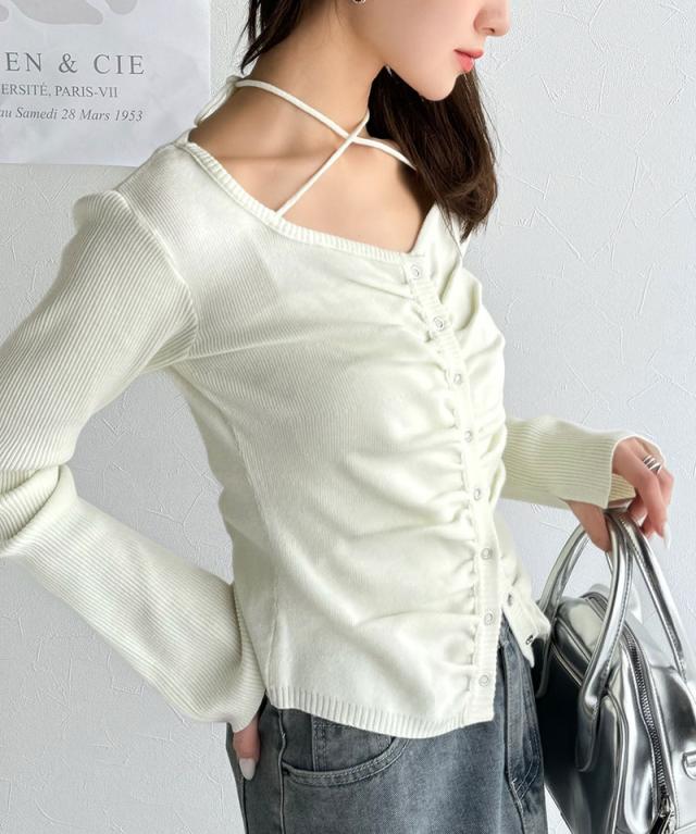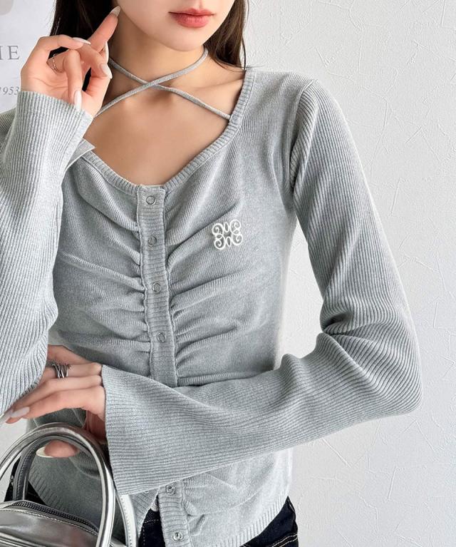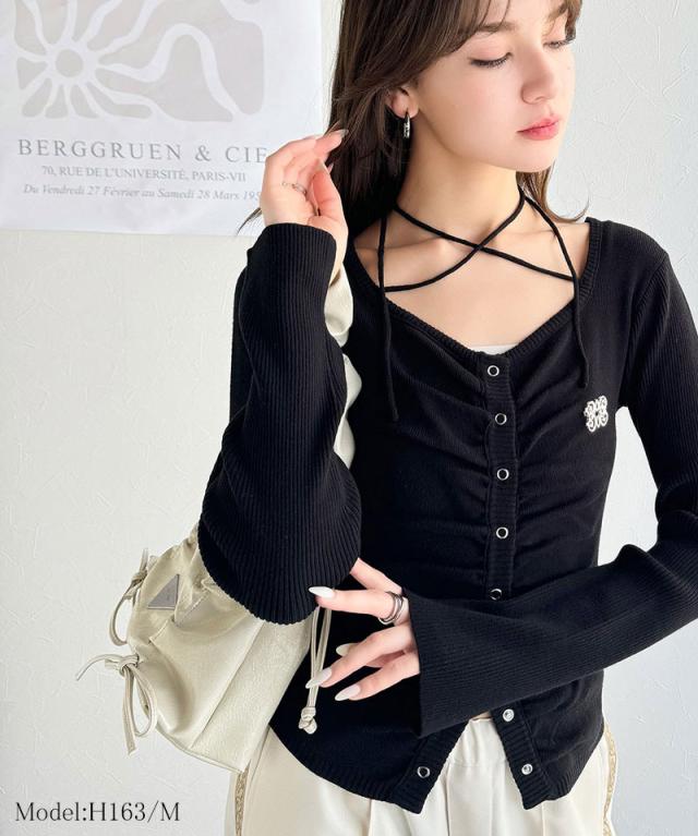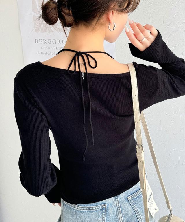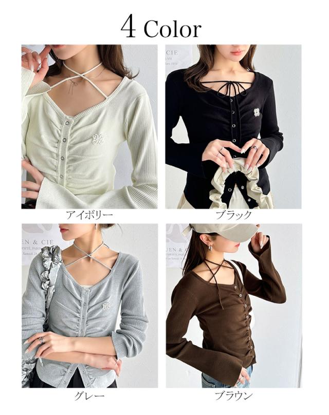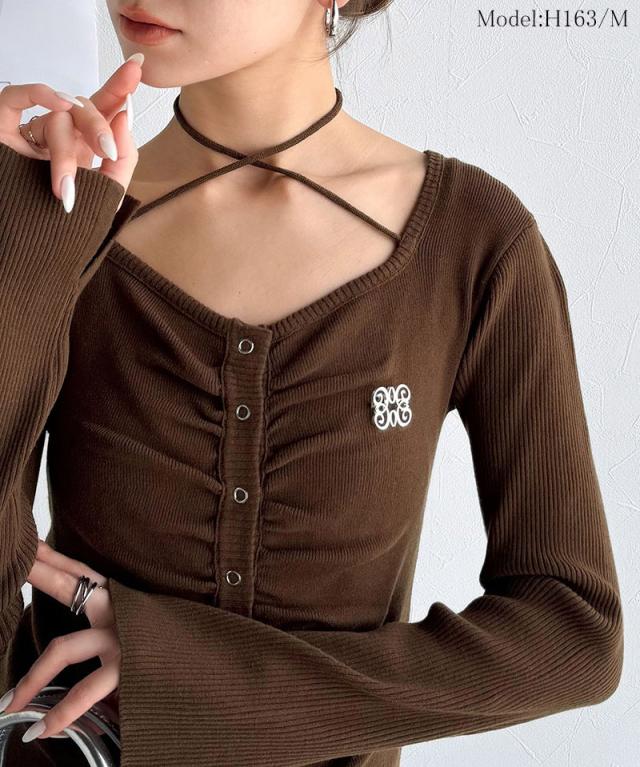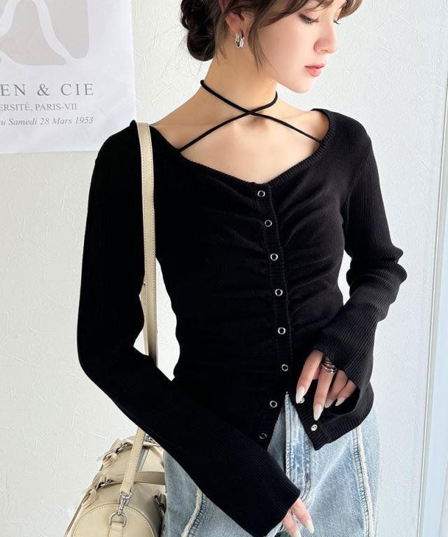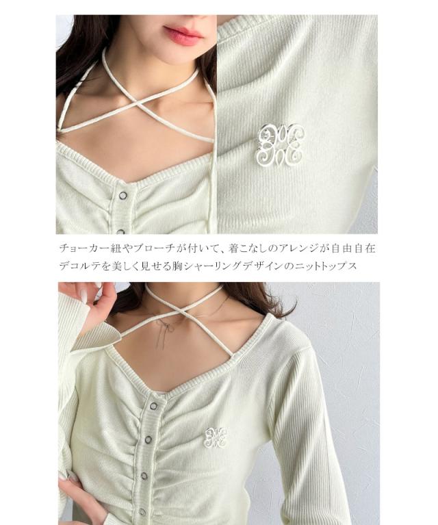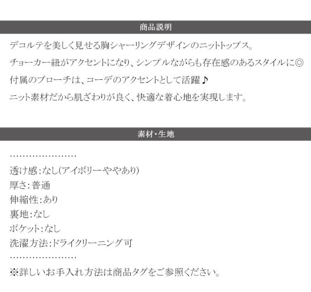 ★【mily bilet】デコルテ華奢魅せ。チョーカー紐&ブローチ付き胸シャーリングニットプルオーバー(長袖)★
