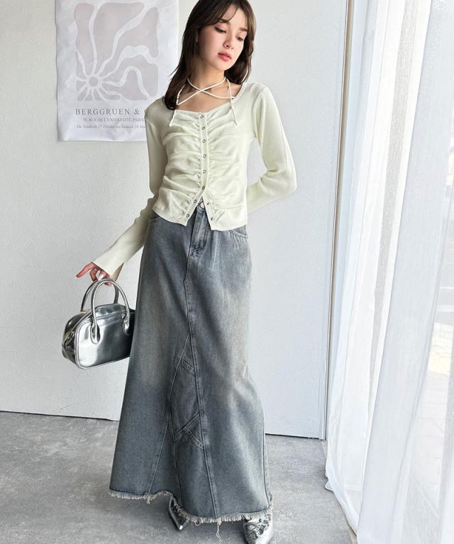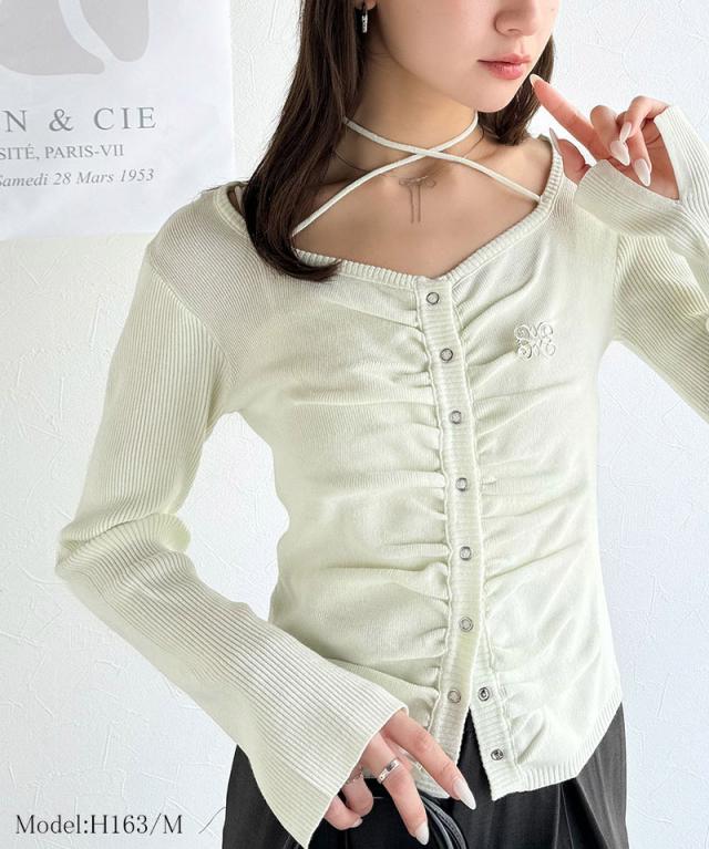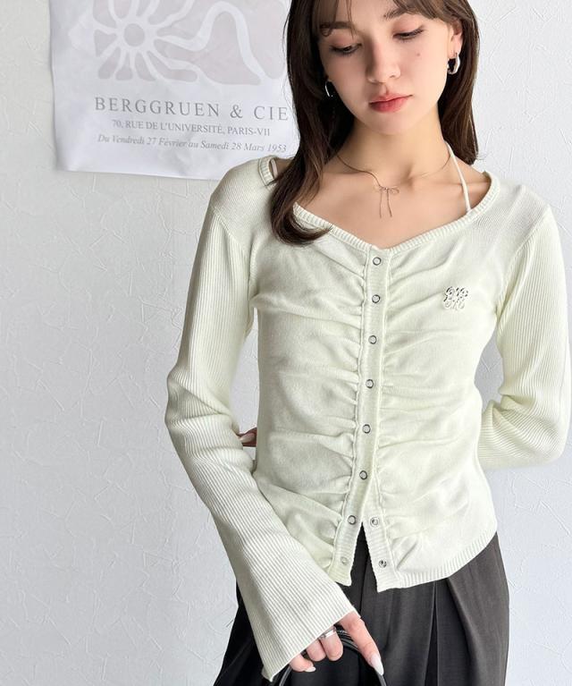 胸元のシャーリングで胸元キレイ見せ効果の洗練ニット。