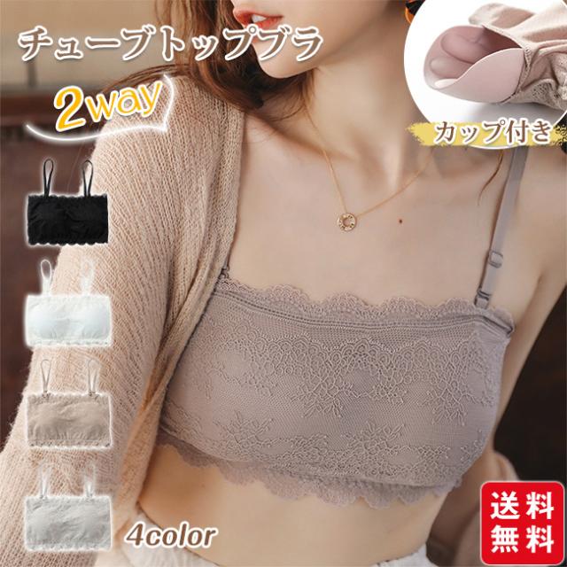 即納 チューブトップブラ 2way キャミソール インナー カップ付き ストラップ取り外し可能 ノンワイヤー 花柄レース 通気性 伸縮性 春夏