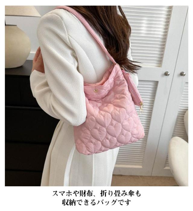 | やわらかな質感で キルティングデザインが おしゃれなショルダーバッグ 鍵やバスの定期券などの小物を収納できる小さなポーチ付き 出し入れしやすく、 ベルトはサイズ調整できて 肩掛けや斜め掛けにも スマホや財布、折り畳み傘も 収納できるバッグです | |