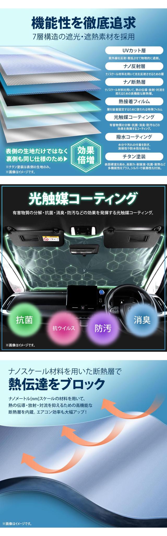 | 暑さを忘れて眠たくなる涼しさ! S/M/L/LL/特殊サイズの5サイズ展開の汎用傘型サンシェード お客様のお声を参考に、従来品から徹底的に改良しました! ★改良ポイント1:2層構造採用 いままで設置時にダッシュボードや内装に当たってしまっていた骨組みを、覆い隠すように裏生地も取り付けることで、傷を防止! 骨組みが隠れることで見た目もスッキリとした印象に♪ 表地と裏地の間に空気層が生まれることで、断熱効果も期待できます。 ★改良ポイント2:骨組み先端にスプリング構造 従来品は骨組みが固く、設置時にダッシュボードを引きずって傷がつくことも…。 改良版は先端にバネを付けることで、衝撃を和らげて傷が付きにくくなりました! 骨組み先端のスプリングで ズレ防止!自由自在にバネを曲げられるから、ダッシュボードの奥まで設置可能。 曲げることが出来るから、多少傘サンシェードが大きくても設置可能です。 ★改良ポイント3:根本から曲がる短めシャフト 改良版は根元からしっかりと曲がるから、自由度アップ! バイザー固定などでシャフトの支えが不要な場合には折り曲げて宙に浮かせると、邪魔にならずに内装にも傷がつきません。 ●どのお車にも取り付けやすい 360°曲がるフレキシブルシャフト&3段階伸縮で車に合わせて調整できる! ミラーポケット付きなので、今までルームミラーが干渉して取付できなかったお車でもV字の開口部にルームミラーをスポッと差し込めるので装着しやすくなっています またマジックテープもついているので、サンシェードの固定にもなります。 ※車種によってルームミラーに取り付けできない場合があります ●傷が入りにくいハンドル保護グリップ ハンドル部分には、熱に強く柔らかいシリコン製エアーポンプグリップを採用。 ぷにぷにとして柔らかいので、ハンドルがダッシュボードや内装・ナビに当たって傷にならないので安心です! ●紫外線を99%カット! サンシェード外側の複合チタン銀コーティングは光の屈折率が高いシェード表面素材は、紫外線を99%遮断して高い断熱能力を発揮します。 駐車時間の車内気温上昇を大幅に抑制したり、車内の内装やシートの劣化、熱変形なども防ぎます。 シェード布地は裏面を黒にしたリバース構造にすることで紫外線や熱エネルギーの反射効果を向上します! ●凹面10本骨構造 シェードの親骨はグラスファイバー繊維を使用。弾力性があり、狭い箇所での設置や調整しやすくなります。簡単に折れにくく耐久性にも優れており、繰り返してご使用いただけます。 |