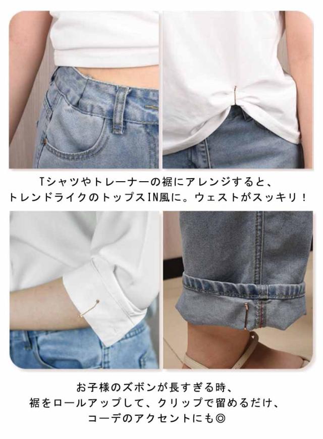 | 挟むだけで簡単にウェストや裾、袖のサイズ調整可能♪ 衣類に穴など付けることなく、ダメージせずに楽々サイズ調整できるY字型クリップ。 お子様のズボンが長すぎる時、裾をロールアップして、クリップで留めるだけ、コーデのアクセントにも◎ Tシャツやトレーナーの裾にアレンジすると、トレンドライクのトップスin風に。ウェストがスッキリ! 繰り返し使え、ズレ落ちる心配がなく、使いやすいウエストクリップ。 | |