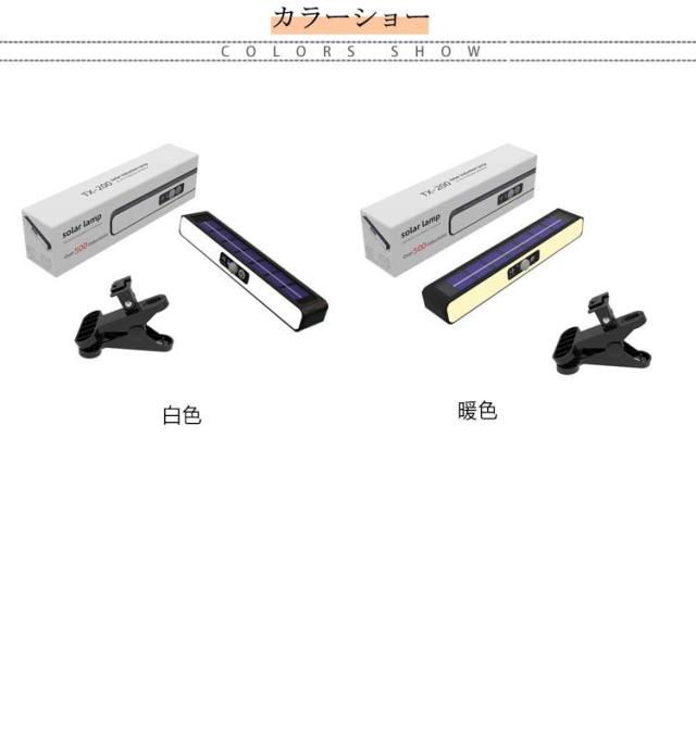| 挟めればどこでも設置OK 配線不要/電気代0円 点灯3モード搭載 ソーラーライト 白色・暖色 今までの概念を覆す! 挟むソーラーライト! こんな悩みありませんか? ・壁に穴を開けるのは抵抗がある… ・ライトがないところは不便… ・ライトを設置できる場所がない… 木の枝や棒など挟めるところならどこでも設置可能。 場所を選ばず感覚的に設置できる シーンに応じて暖色・白色あります! 設置場所に応じてタイプが選べます。 配線要らず!電気代も0円省エネ! 日中は太陽光で6〜8時間充電し、夜間になると自動で点灯します! ※天候状態により充電が不足すると点灯しないことや点滅することがあります。 3つの便利な点灯モードを搭載! 3つのモードがあり、用途に応じて設定が可能です。 人感センサー、常灯モードとシーンに合わせてお使い頂けます。 雨に強く耐久性が高い、IP68仕様。 120度角度調整が可能で 設置場所や照らしたい場所でお好みの 角度で設置できます。 大型LEDチップを36個使用 驚異トップクラスの明るさ 自宅だけでなくアウトドアなどで 持ち運びもできる手軽さなので 使いたいときにサッと持ち運んだり取り付けができます。 人感センサーは2パターンあり モード1は人が通ると点灯し、人を感知しなくなると低輝度で点灯します。 モード2は人が通ると点灯し、一定時間で自動で消灯します。 モード3は常灯モードで夜間ソーラーパネルに光が当たっていない場合常に光り続けます。 明暗センサーが搭載され、夜間になれば自動的に電源がオンになり、 朝になると自動的にオフになります。 防水防塵仕様のため、雨風の強い荒天時でも使用可能です。 玄関先や庭・駐車場など屋根のない場所でも使えてとても便利です。 屋外のエクステリアはもちろん、ガーデンライト、玄関灯、夜間での作業など クリップ式なので取り付け持ち運びに優れており、利便性が高いです。 | |