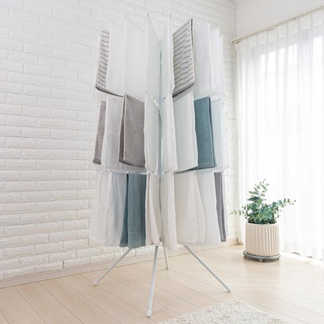 省スペースで大量に干せる3段パラソルタイプの物干しです。組み立ては工具不要の差し込むだけなので簡単です。ご家庭だけでなく、保育施設や病院、理髪店など、さまざまな場所で活躍しそうです。