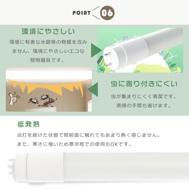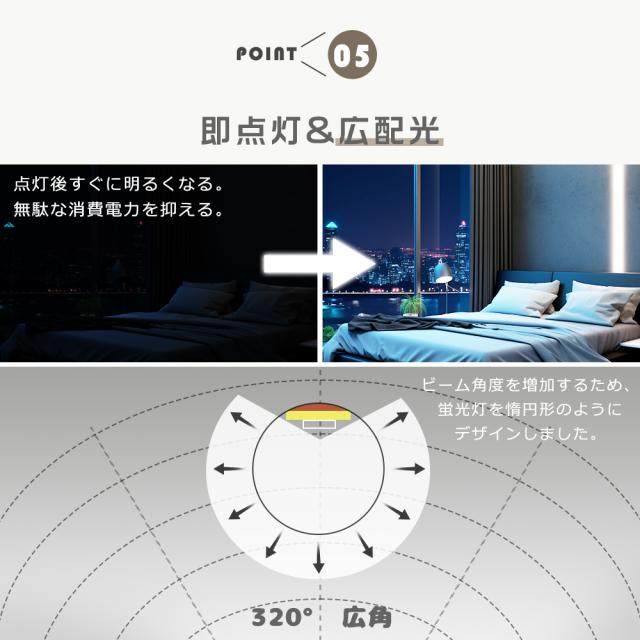 ・電源を入れた瞬間に全灯し、点灯直後からすぐに部屋が明るくなります。通常の蛍光灯は点灯してからじわじわと明るさが増すのに対し、LED蛍光灯は瞬時に最大の明るさに到達するのが魅力の一つです。